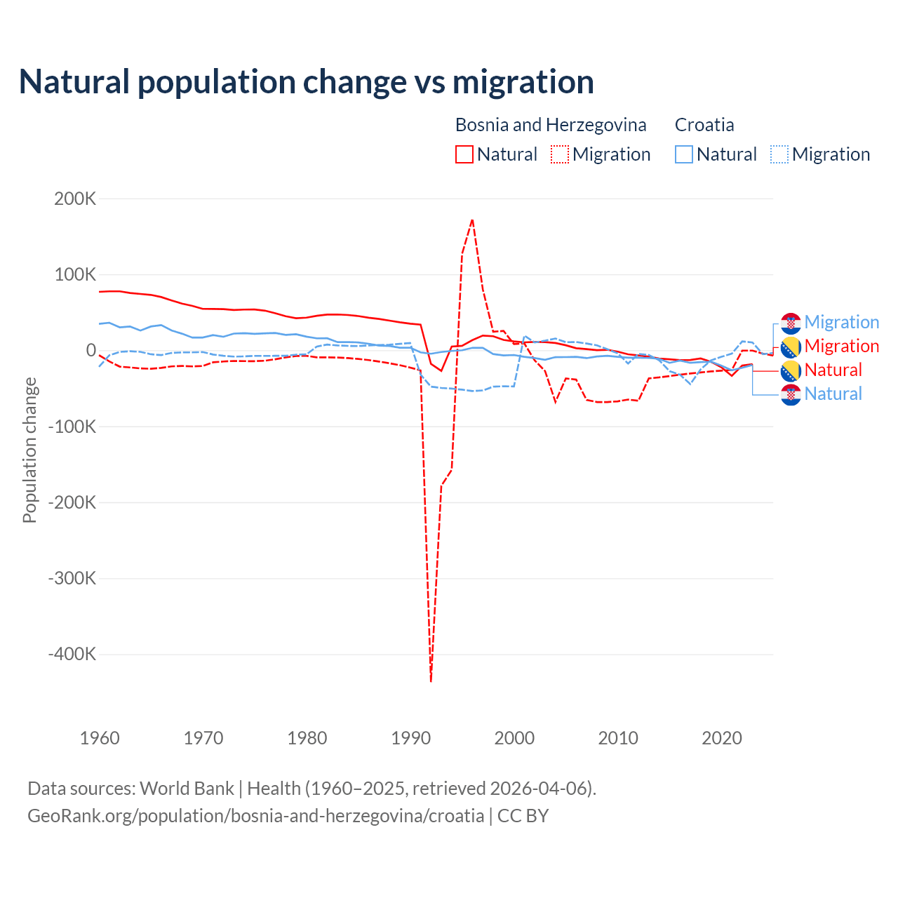Over the last 10 years, 41.1% of the population change in Bosnia and Herzegovina is from natural causes (a loss of 169,384 people) and 58.9% is from migration (a loss of 243,117 people). In Croatia 54.8% is from natural causes (a loss of 177,803 people) and 45.2% is from migration (a loss of 146,770 people).