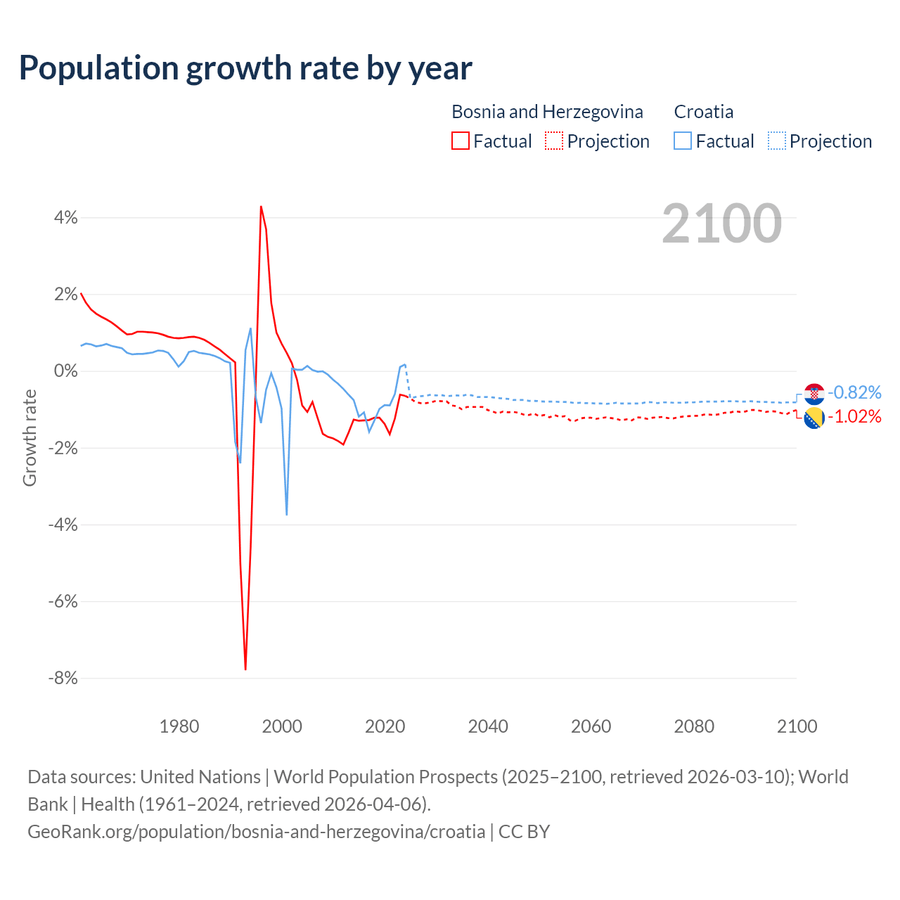 - For the last 10 years, Bosnia and Herzegovina has had an average growth rate of -1.19% per year vs -0.82% in Croatia.