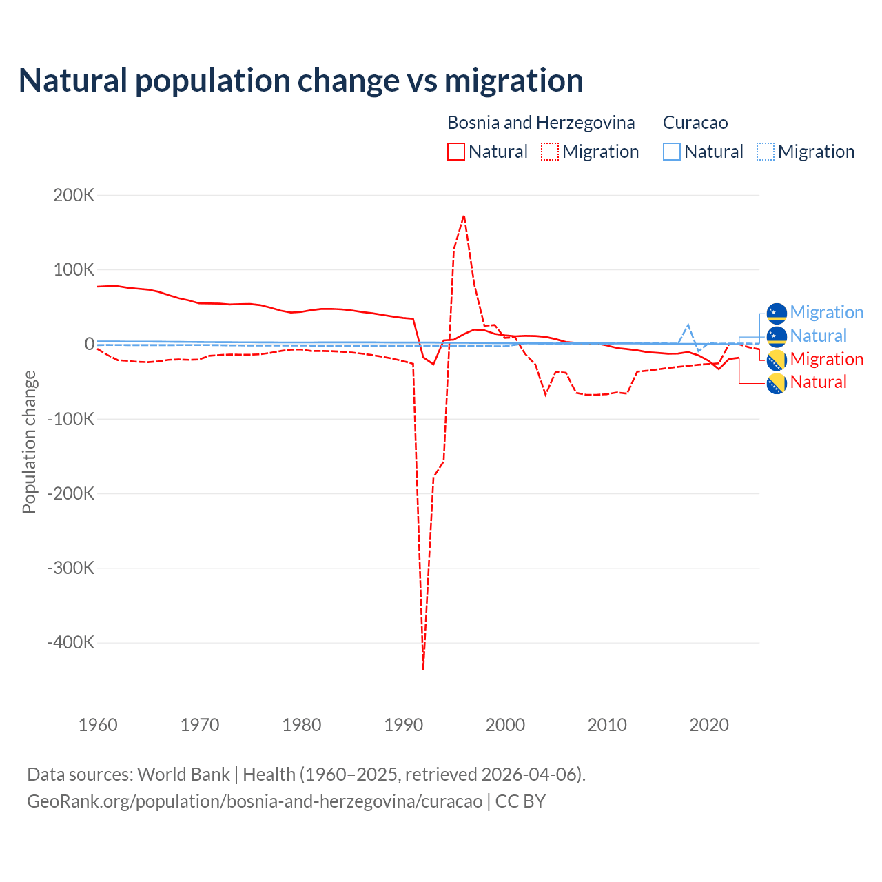 Over the last 10 years, 41.1% of the population change in Bosnia and Herzegovina is from natural causes (a loss of 169,384 people) and 58.9% is from migration (a loss of 243,117 people). In Curacao 3.72% is from natural causes (a gain of 834 people) and 96.3% is from migration (a gain of 21,615 people).