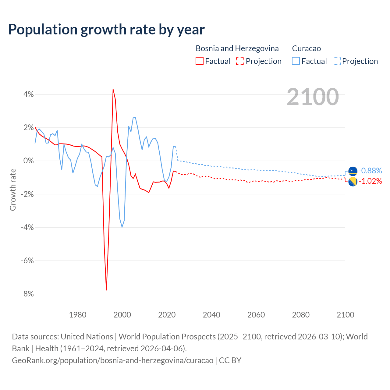 - For the last 10 years, Bosnia and Herzegovina has had an average growth rate of -1.19% per year vs +0.13% in Curacao.