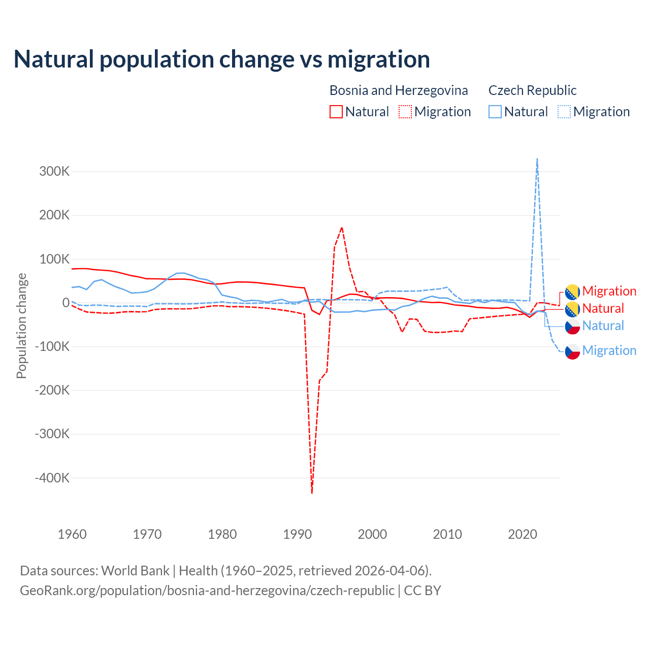 Over the last 10 years, 41.1% of the population change in Bosnia and Herzegovina is from natural causes (a loss of 169,384 people) and 58.9% is from migration (a loss of 243,117 people). In the Czech Republic 17.3% is from natural causes (a loss of 74,826 people) and 82.7% is from migration (a gain of 357,502 people).