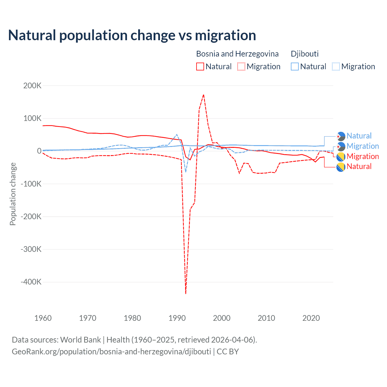 Over the last 10 years, 41.1% of the population change in Bosnia and Herzegovina is from natural causes (a loss of 169,384 people) and 58.9% is from migration (a loss of 243,117 people). In Djibouti 92.1% is from natural causes (a gain of 153,892 people) and 7.87% is from migration (a gain of 13,138 people).