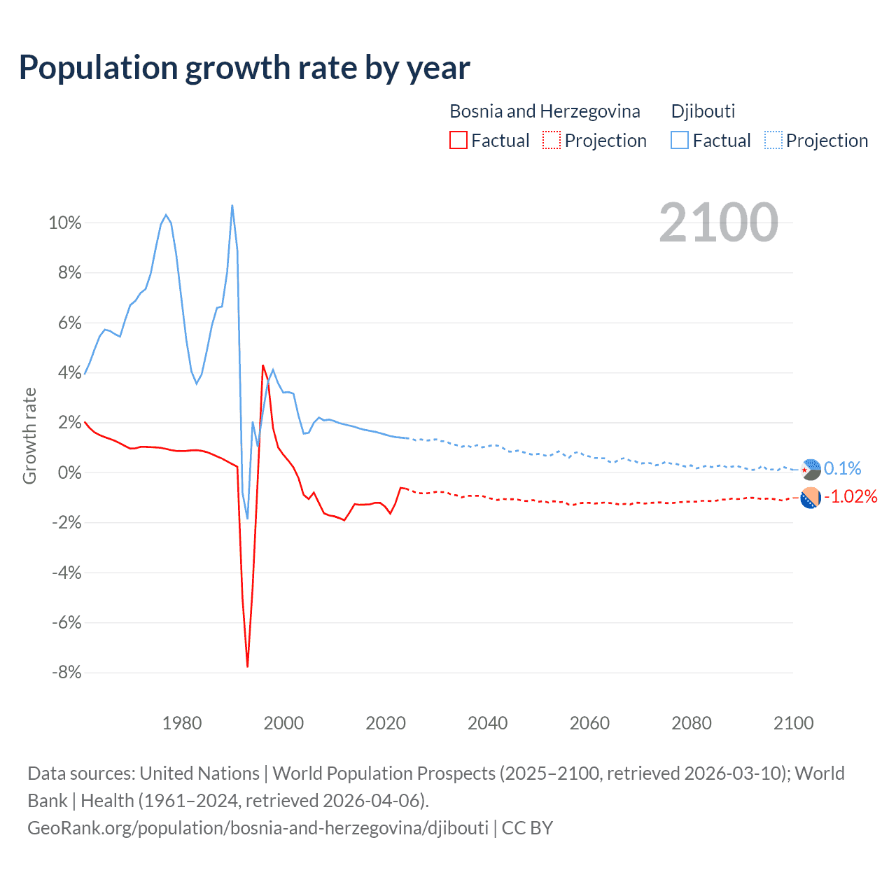 - For the last 10 years, Bosnia and Herzegovina has had an average growth rate of -1.19% per year vs +1.57% in Djibouti.