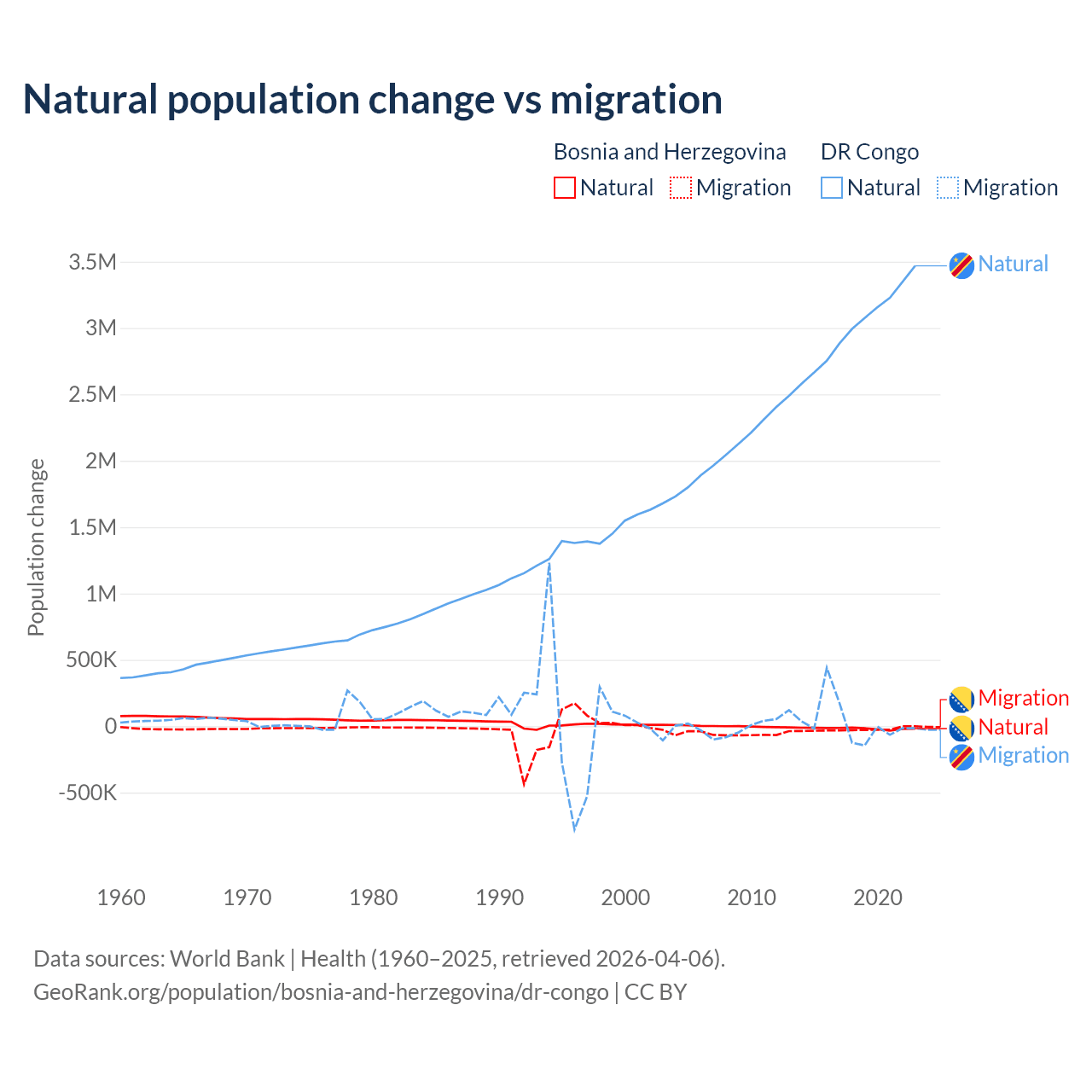 Over the last 10 years, 41.1% of the population change in Bosnia and Herzegovina is from natural causes (a loss of 169,384 people) and 58.9% is from migration (a loss of 243,117 people). In the DR Congo 99.1% is from natural causes (a gain of 30,150,516 people) and 0.89% is from migration (a gain of 270,872 people).