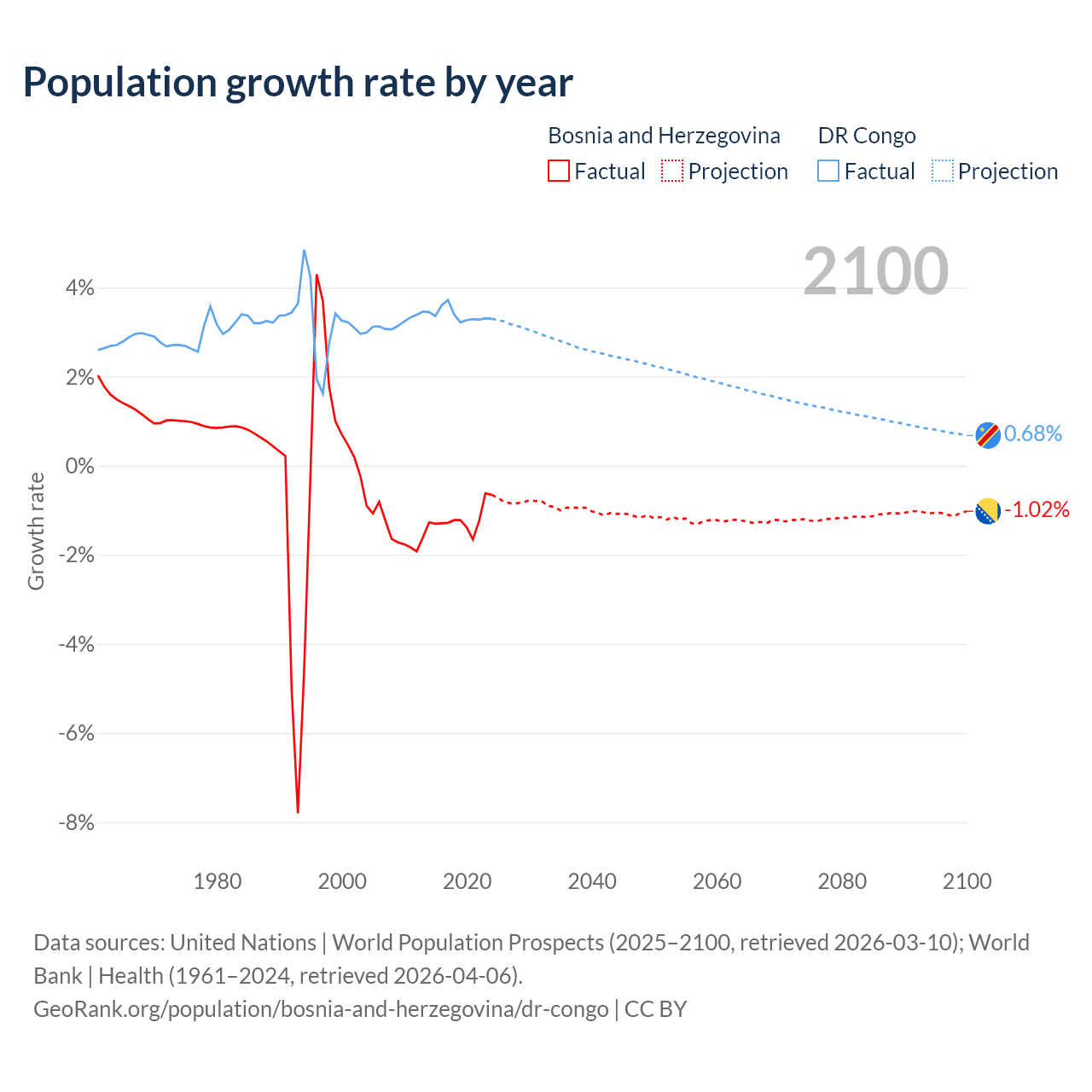 - For the last 10 years, Bosnia and Herzegovina has had an average growth rate of -1.19% per year vs +3.38% in the DR Congo.