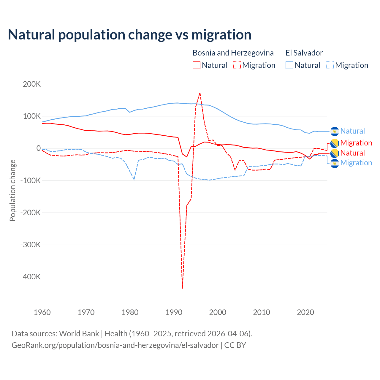Over the last 10 years, 41.1% of the population change in Bosnia and Herzegovina is from natural causes (a loss of 169,384 people) and 58.9% is from migration (a loss of 243,117 people). In El Salvador 58.8% is from natural causes (a gain of 579,641 people) and 41.2% is from migration (a loss of 406,874 people).