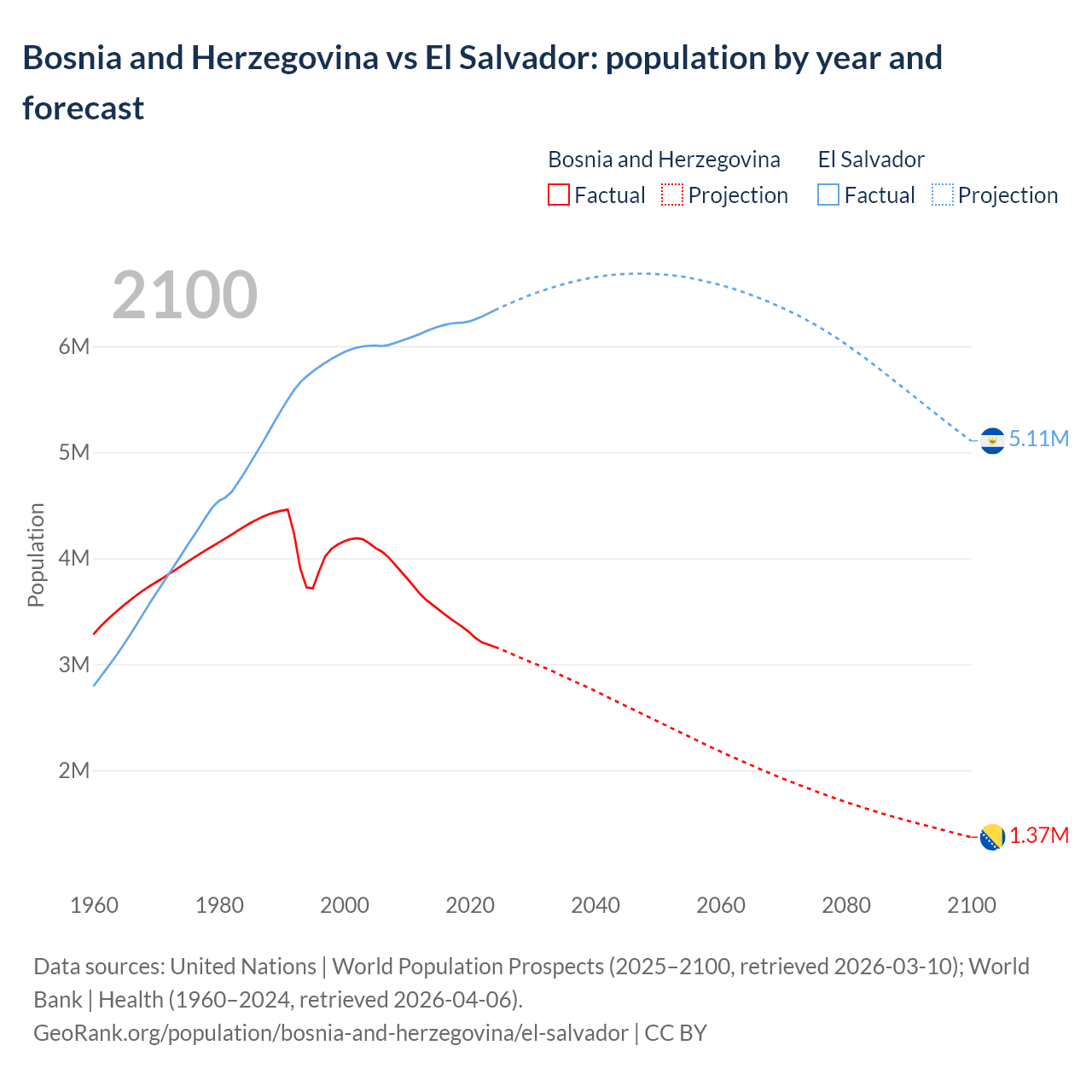 - Since 2006, the population of Bosnia and Herzegovina has decreased from 4.06M people to 3.12M (23.3% decline), while El Salvador has grown from 6M to 6.4M (6.62% growth).