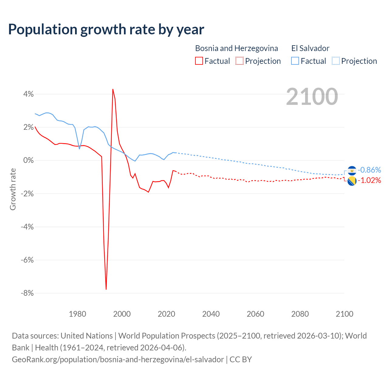 - For the last 10 years, Bosnia and Herzegovina has had an average growth rate of -1.19% per year vs +0.29% in El Salvador.