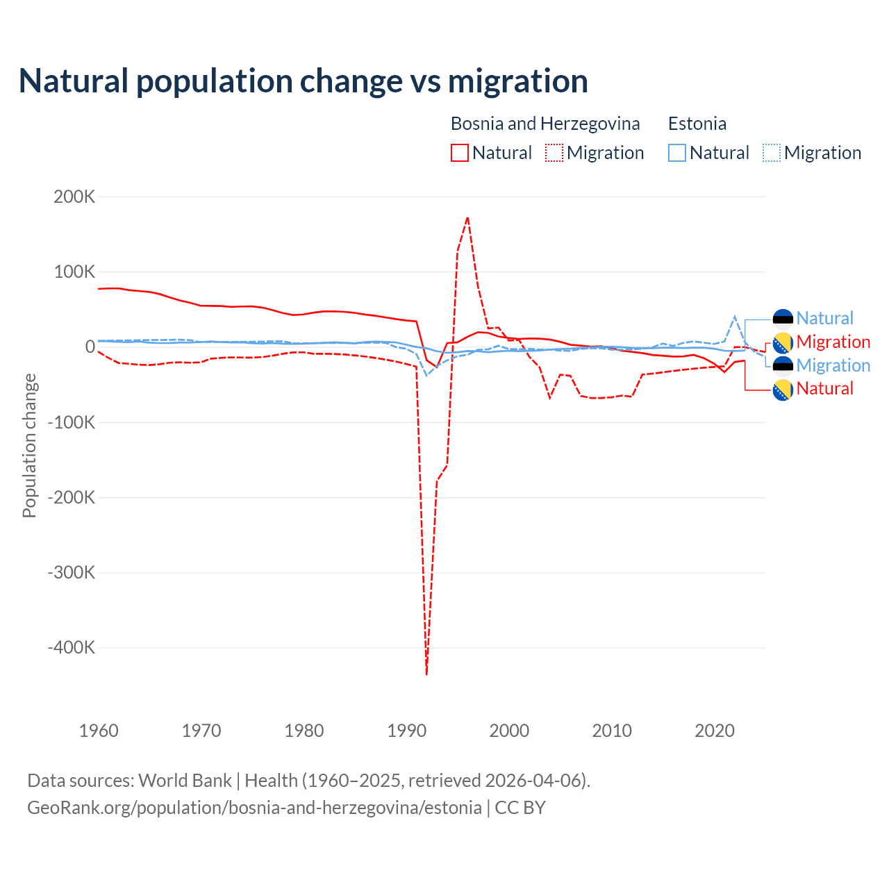 Over the last 10 years, 41.1% of the population change in Bosnia and Herzegovina is from natural causes (a loss of 169,384 people) and 58.9% is from migration (a loss of 243,117 people). In Estonia 26.1% is from natural causes (a loss of 27,683 people) and 73.9% is from migration (a gain of 78,553 people).