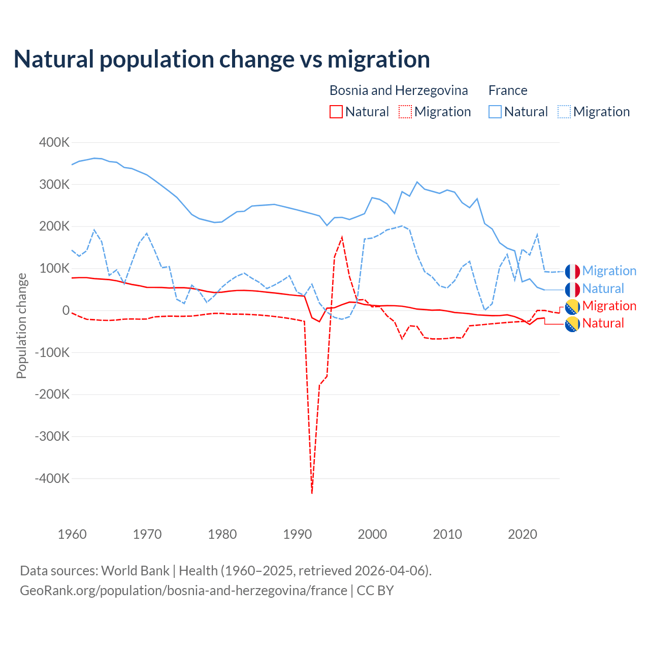 Over the last 10 years, 41.1% of the population change in Bosnia and Herzegovina is from natural causes (a loss of 169,384 people) and 58.9% is from migration (a loss of 243,117 people). In France 59.5% is from natural causes (a gain of 1,359,540 people) and 40.5% is from migration (a gain of 923,723 people).