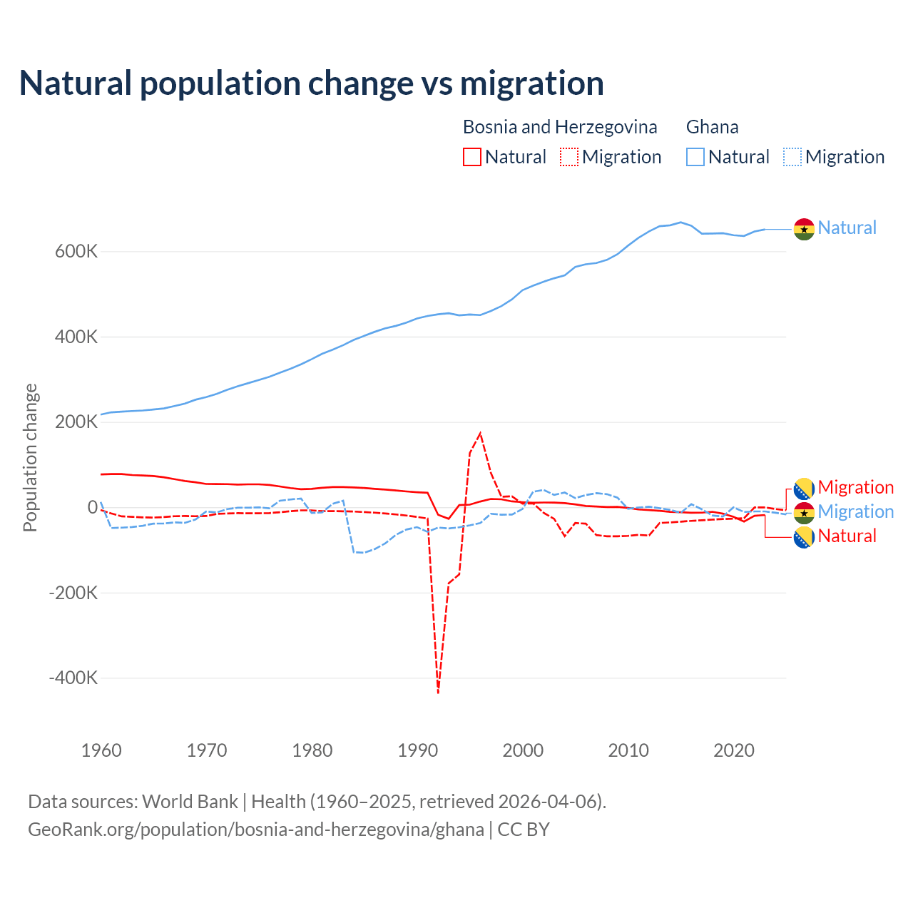 Over the last 10 years, 41.1% of the population change in Bosnia and Herzegovina is from natural causes (a loss of 169,384 people) and 58.9% is from migration (a loss of 243,117 people). In Ghana 98.6% is from natural causes (a gain of 6,484,449 people) and 1.37% is from migration (a loss of 90,310 people).