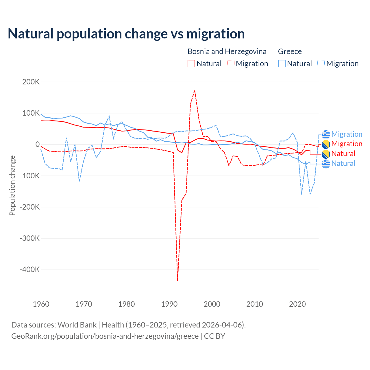 Over the last 10 years, 41.1% of the population change in Bosnia and Herzegovina is from natural causes (a loss of 169,384 people) and 58.9% is from migration (a loss of 243,117 people). In Greece 51.9% is from natural causes (a loss of 411,426 people) and 48.1% is from migration (a loss of 381,824 people).