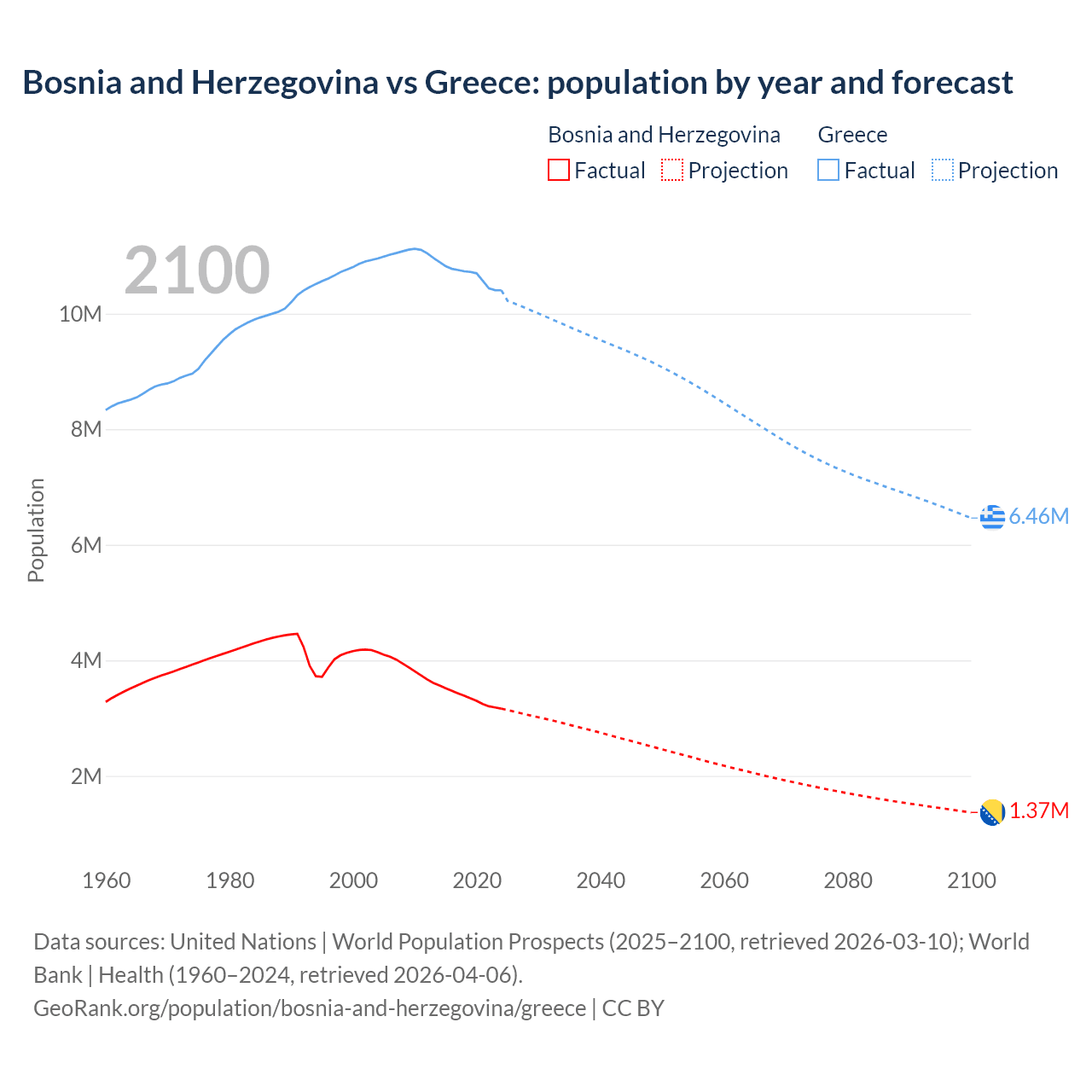 Bosnia and Herzegovina vs Greece: population by year and forecast