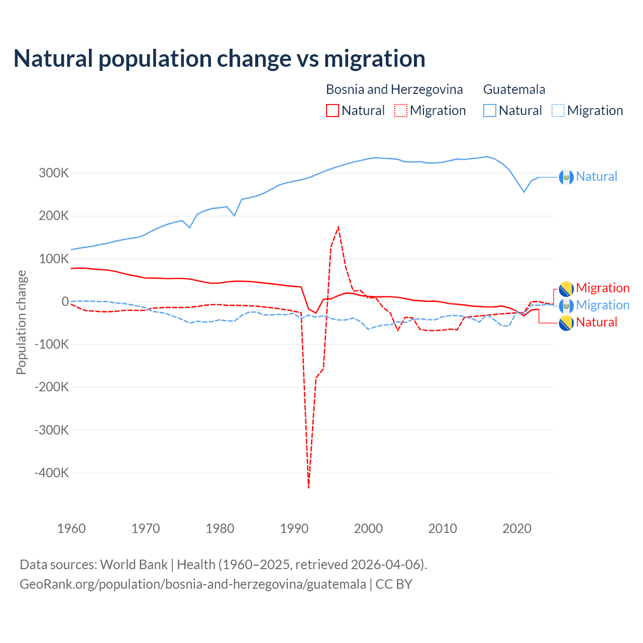 Over the last 10 years, 41.1% of the population change in Bosnia and Herzegovina is from natural causes (a loss of 169,384 people) and 58.9% is from migration (a loss of 243,117 people). In Guatemala 89.8% is from natural causes (a gain of 3,077,847 people) and 10.2% is from migration (a loss of 347,818 people).