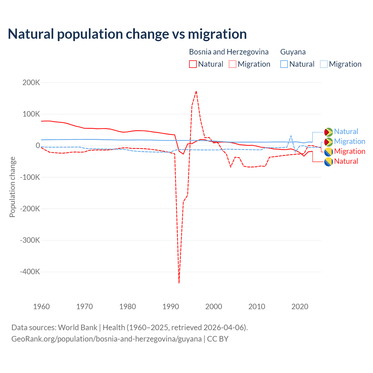 Over the last 10 years, 41.1% of the population change in Bosnia and Herzegovina is from natural causes (a loss of 169,384 people) and 58.9% is from migration (a loss of 243,117 people). In Guyana 77.7% is from natural causes (a gain of 107,419 people) and 22.3% is from migration (a loss of 30,797 people).