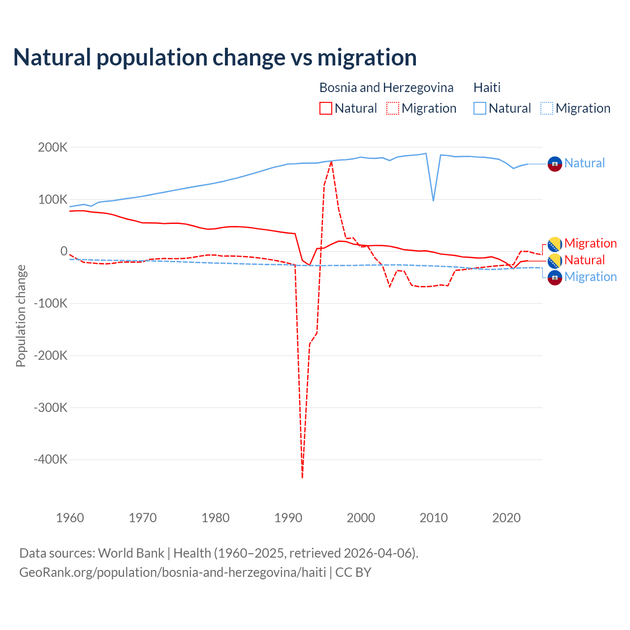 Over the last 10 years, 41.1% of the population change in Bosnia and Herzegovina is from natural causes (a loss of 169,384 people) and 58.9% is from migration (a loss of 243,117 people). In Haiti 83.9% is from natural causes (a gain of 1,740,319 people) and 16.1% is from migration (a loss of 333,076 people).
