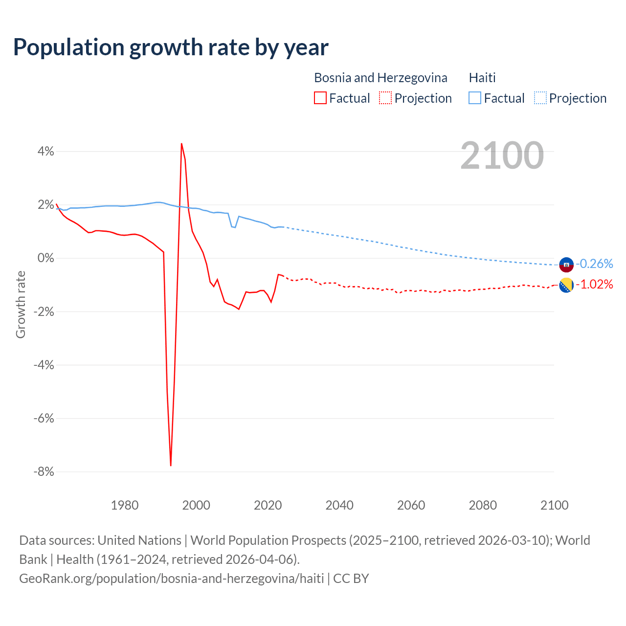 - For the last 10 years, Bosnia and Herzegovina has had an average growth rate of -1.19% per year vs +1.29% in Haiti.