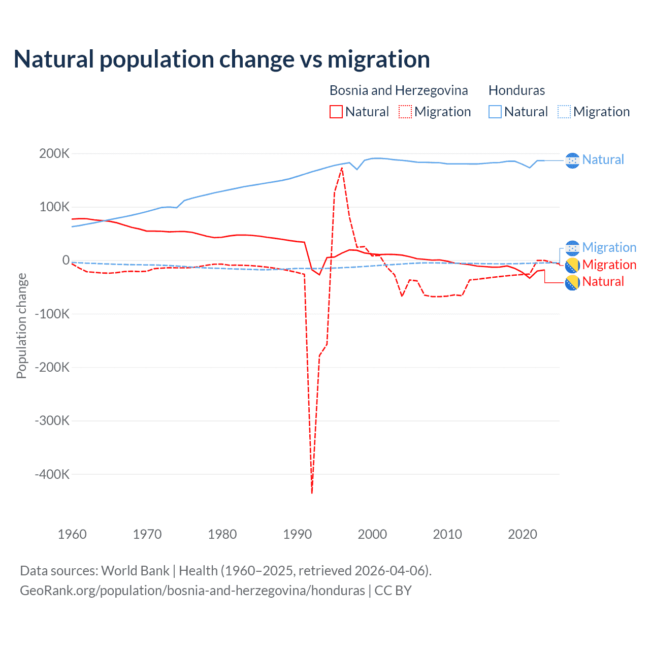 Over the last 10 years, 41.1% of the population change in Bosnia and Herzegovina is from natural causes (a loss of 169,384 people) and 58.9% is from migration (a loss of 243,117 people). In Honduras 96.7% is from natural causes (a gain of 1,821,125 people) and 3.29% is from migration (a loss of 61,965 people).