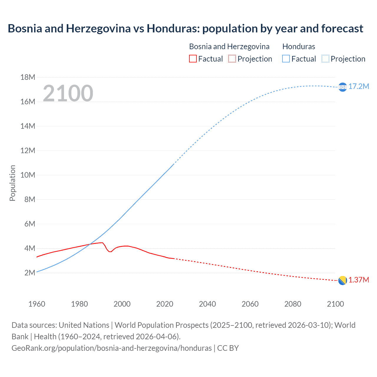 Bosnia and Herzegovina vs Honduras: population by year and forecast