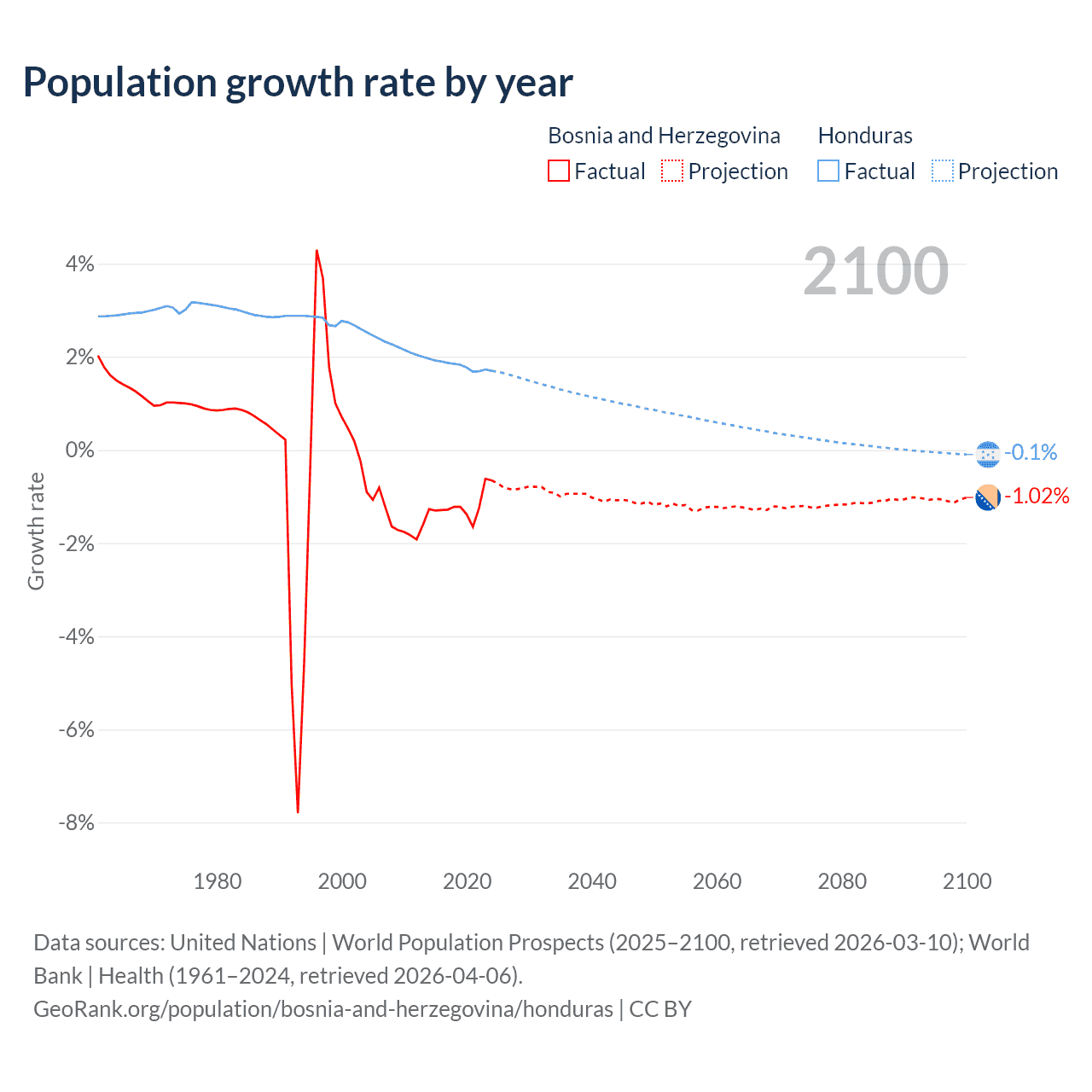 - For the last 10 years, Bosnia and Herzegovina has had an average growth rate of -1.19% per year vs +1.81% in Honduras.