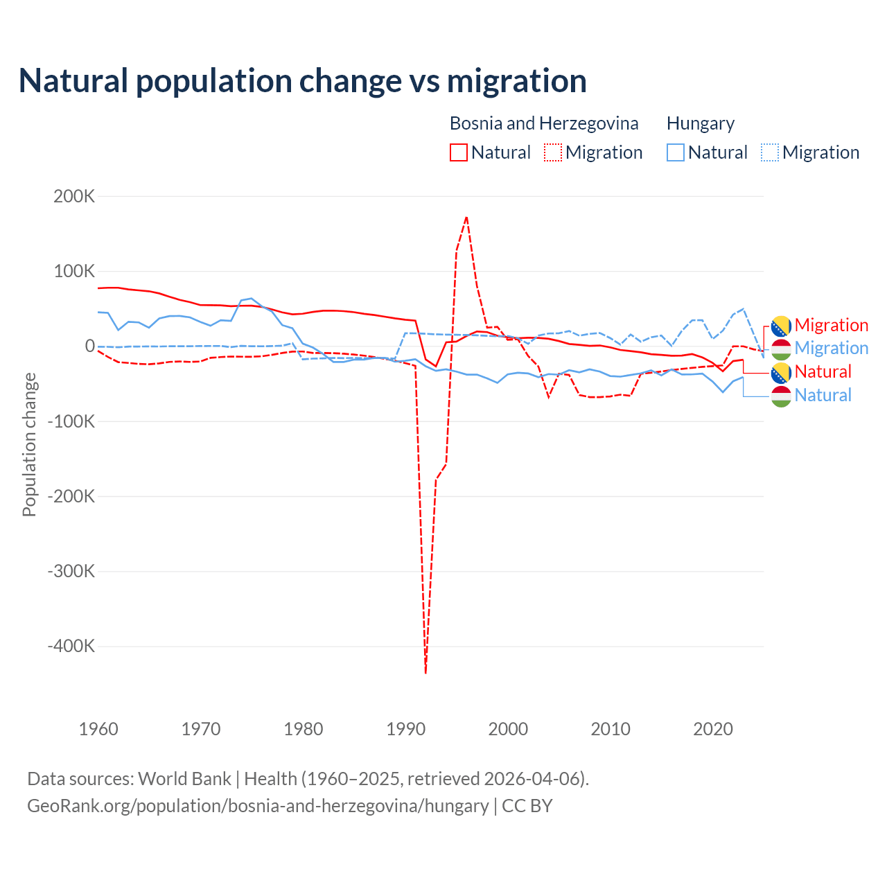 Over the last 10 years, 41.1% of the population change in Bosnia and Herzegovina is from natural causes (a loss of 169,384 people) and 58.9% is from migration (a loss of 243,117 people). In Hungary 63.7% is from natural causes (a loss of 412,838 people) and 36.3% is from migration (a gain of 234,837 people).