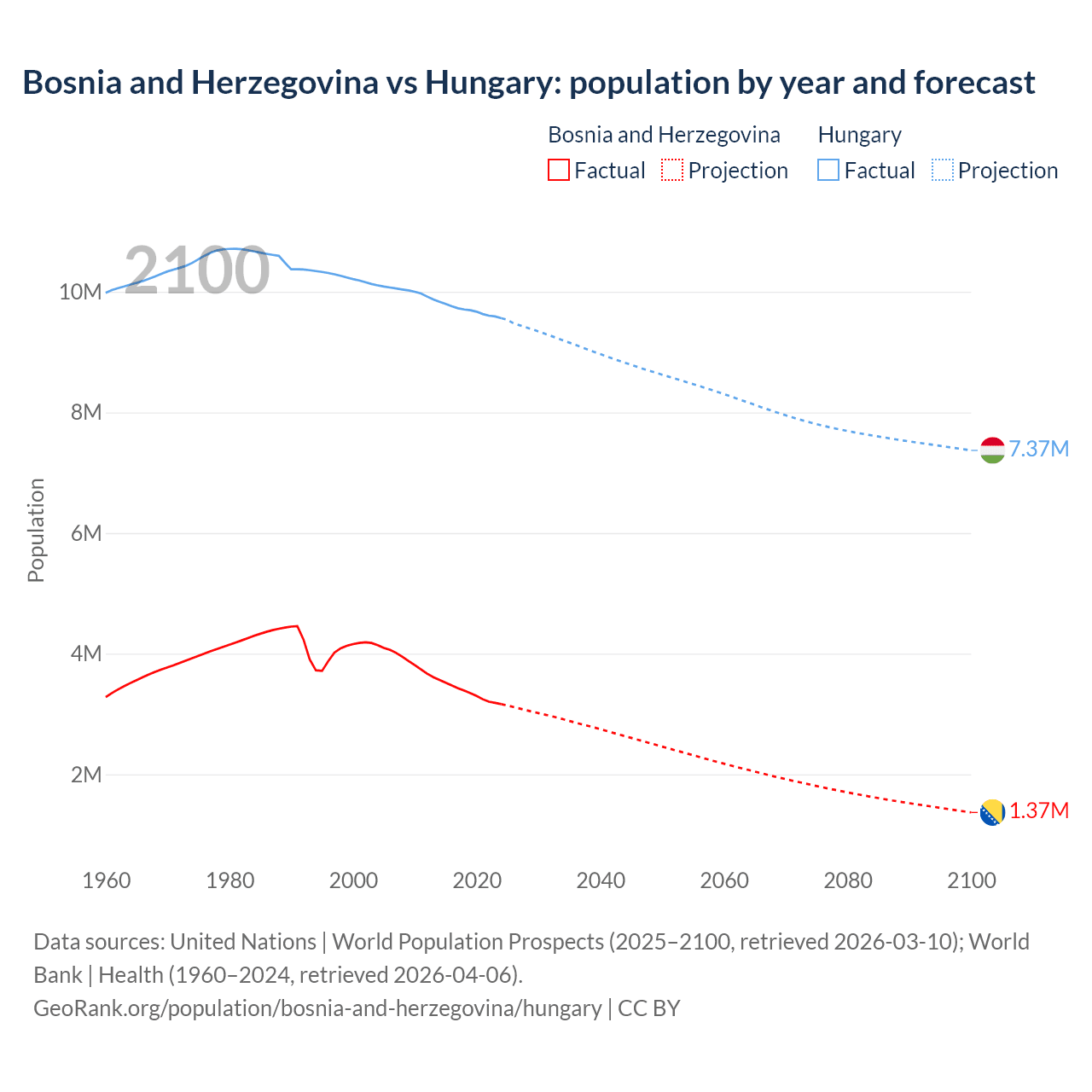 Bosnia and Herzegovina vs Hungary: population by year and forecast