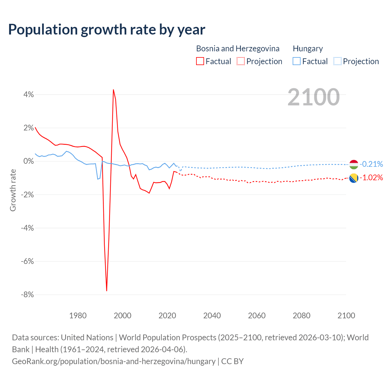 - For the last 10 years, Bosnia and Herzegovina has had an average growth rate of -1.19% per year vs -0.29% in Hungary.