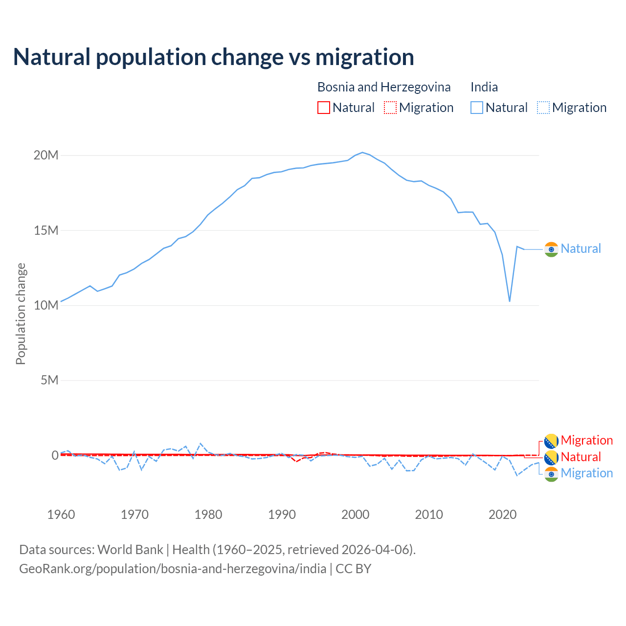 Over the last 10 years, 41.1% of the population change in Bosnia and Herzegovina is from natural causes (a loss of 169,384 people) and 58.9% is from migration (a loss of 243,117 people). In India 96.4% is from natural causes (a gain of 145,503,378 people) and 3.56% is from migration (a loss of 5,376,884 people).