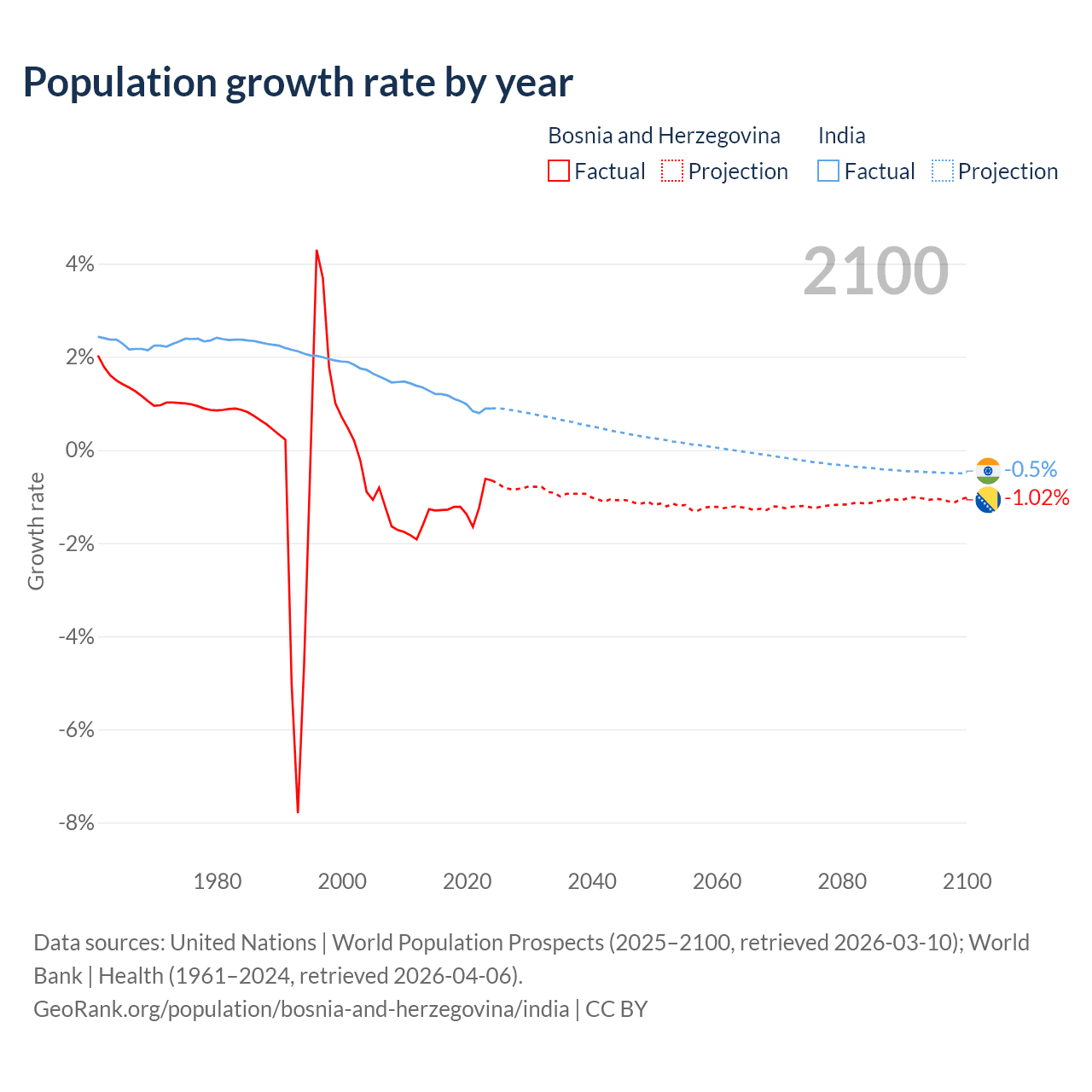 - For the last 10 years, Bosnia and Herzegovina has had an average growth rate of -1.19% per year vs +1.03% in India.