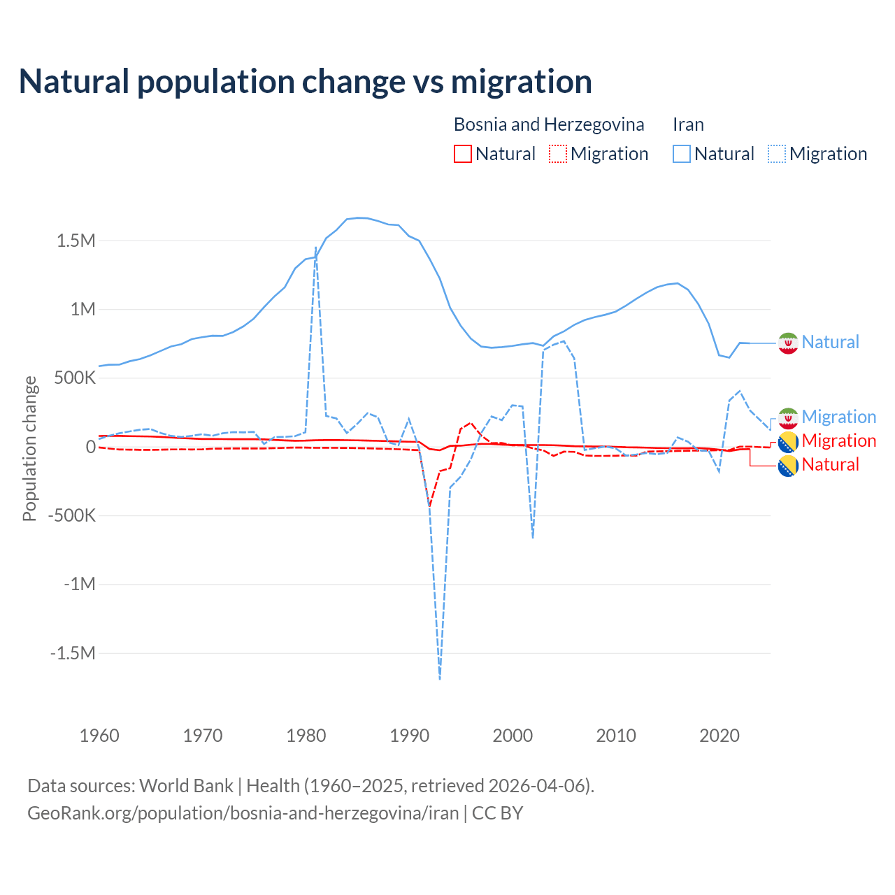 Over the last 10 years, 41.1% of the population change in Bosnia and Herzegovina is from natural causes (a loss of 169,384 people) and 58.9% is from migration (a loss of 243,117 people). In Iran 92.5% is from natural causes (a gain of 9,405,860 people) and 7.46% is from migration (a gain of 757,979 people).