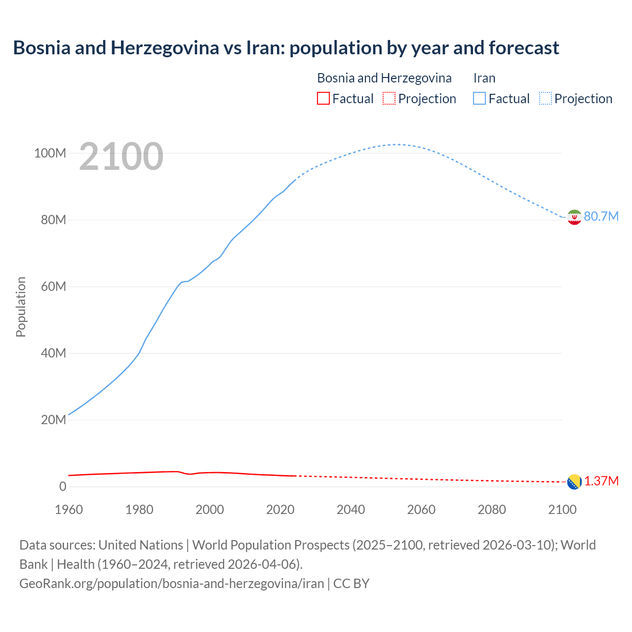 Bosnia and Herzegovina vs Iran: population by year and forecast