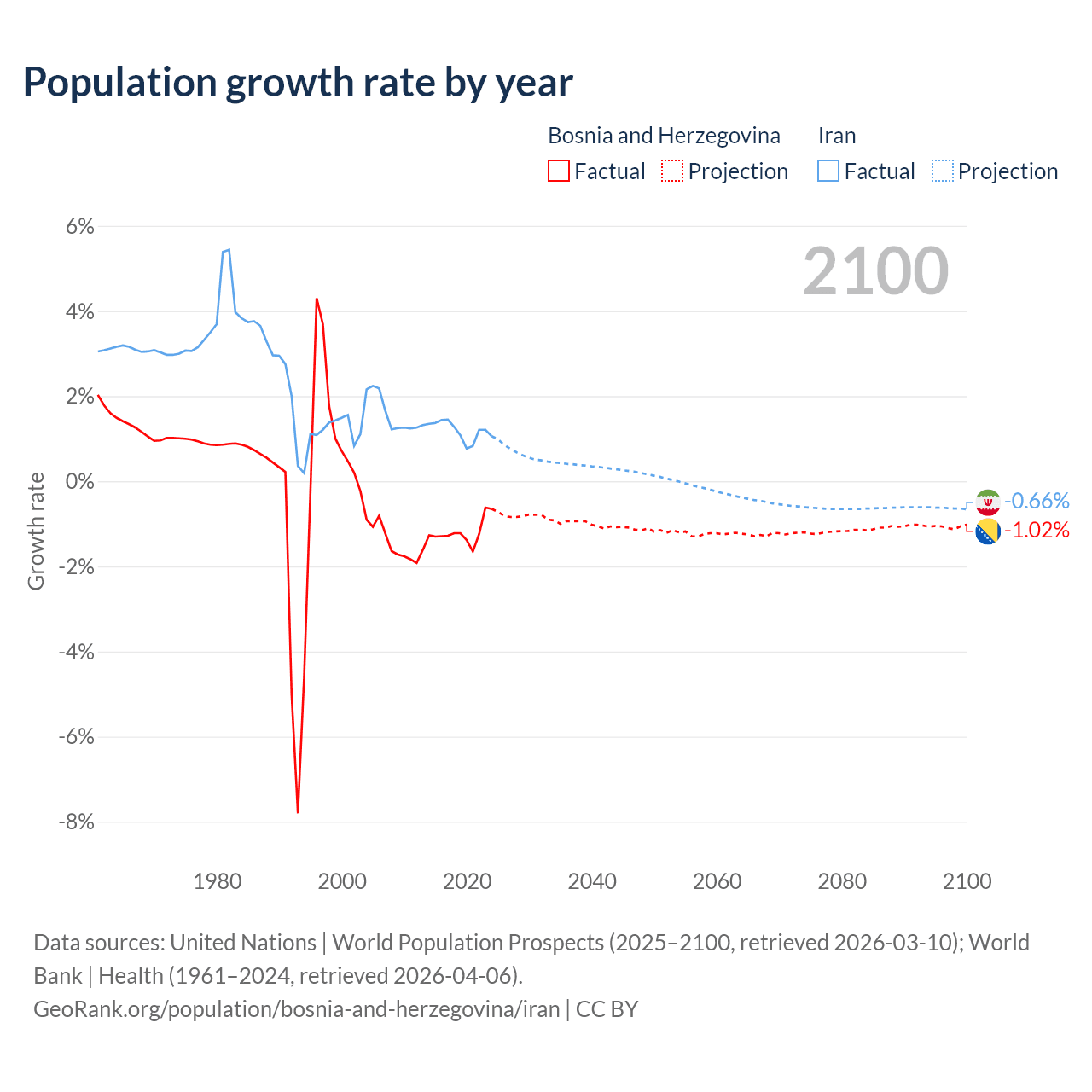 - For the last 10 years, Bosnia and Herzegovina has had an average growth rate of -1.19% per year vs +1.19% in Iran.