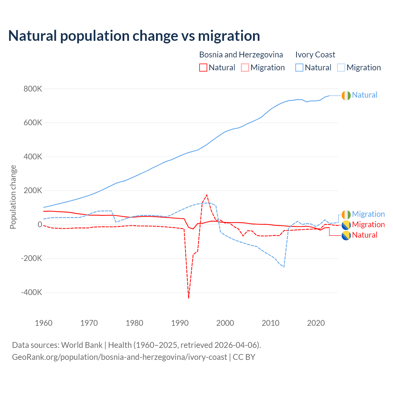 Over the last 10 years, 41.1% of the population change in Bosnia and Herzegovina is from natural causes (a loss of 169,384 people) and 58.9% is from migration (a loss of 243,117 people). In Ivory Coast 99.7% is from natural causes (a gain of 7,348,944 people) and 0.33% is from migration (a gain of 24,432 people).