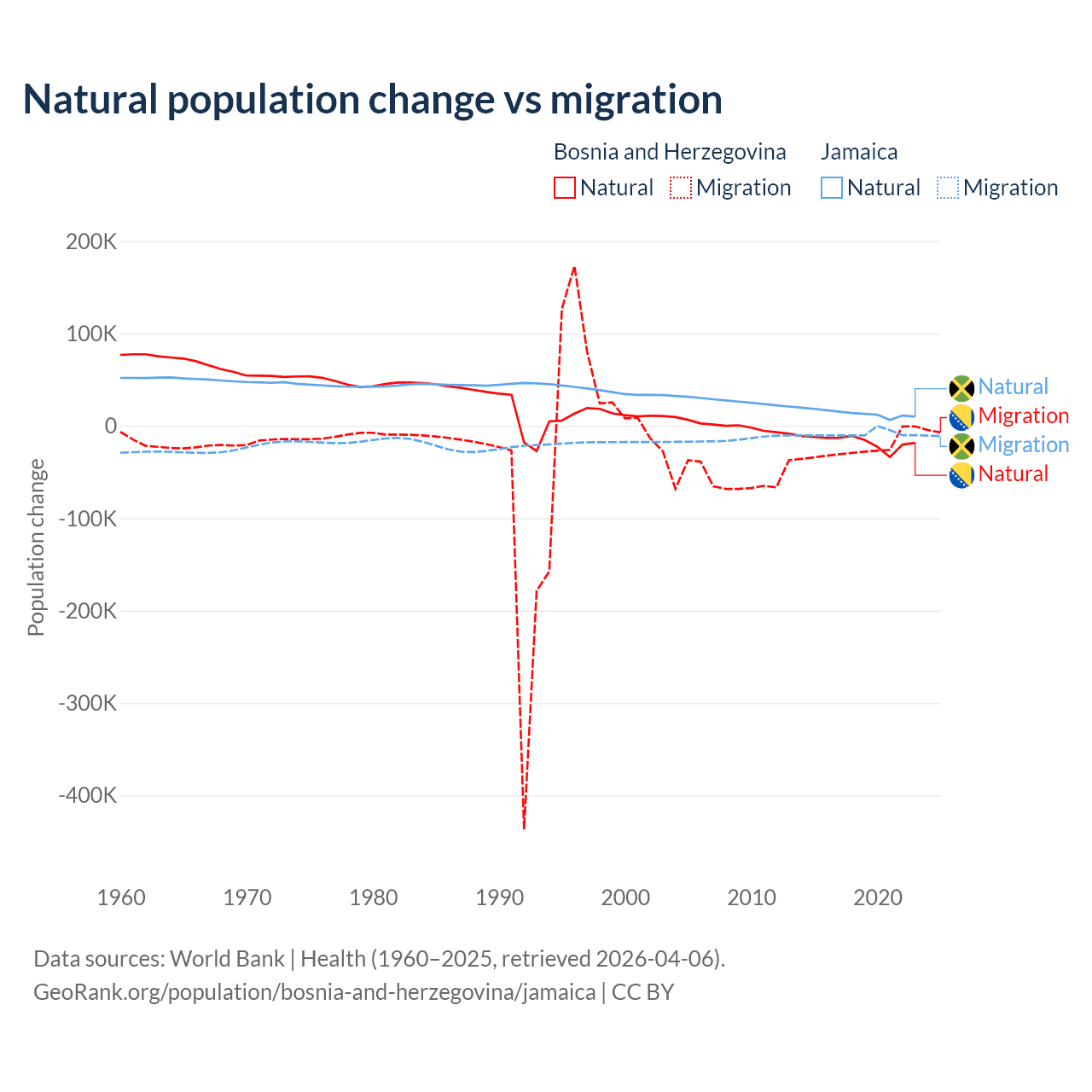 Over the last 10 years, 41.1% of the population change in Bosnia and Herzegovina is from natural causes (a loss of 169,384 people) and 58.9% is from migration (a loss of 243,117 people). In Jamaica 61.3% is from natural causes (a gain of 137,465 people) and 38.7% is from migration (a loss of 86,681 people).