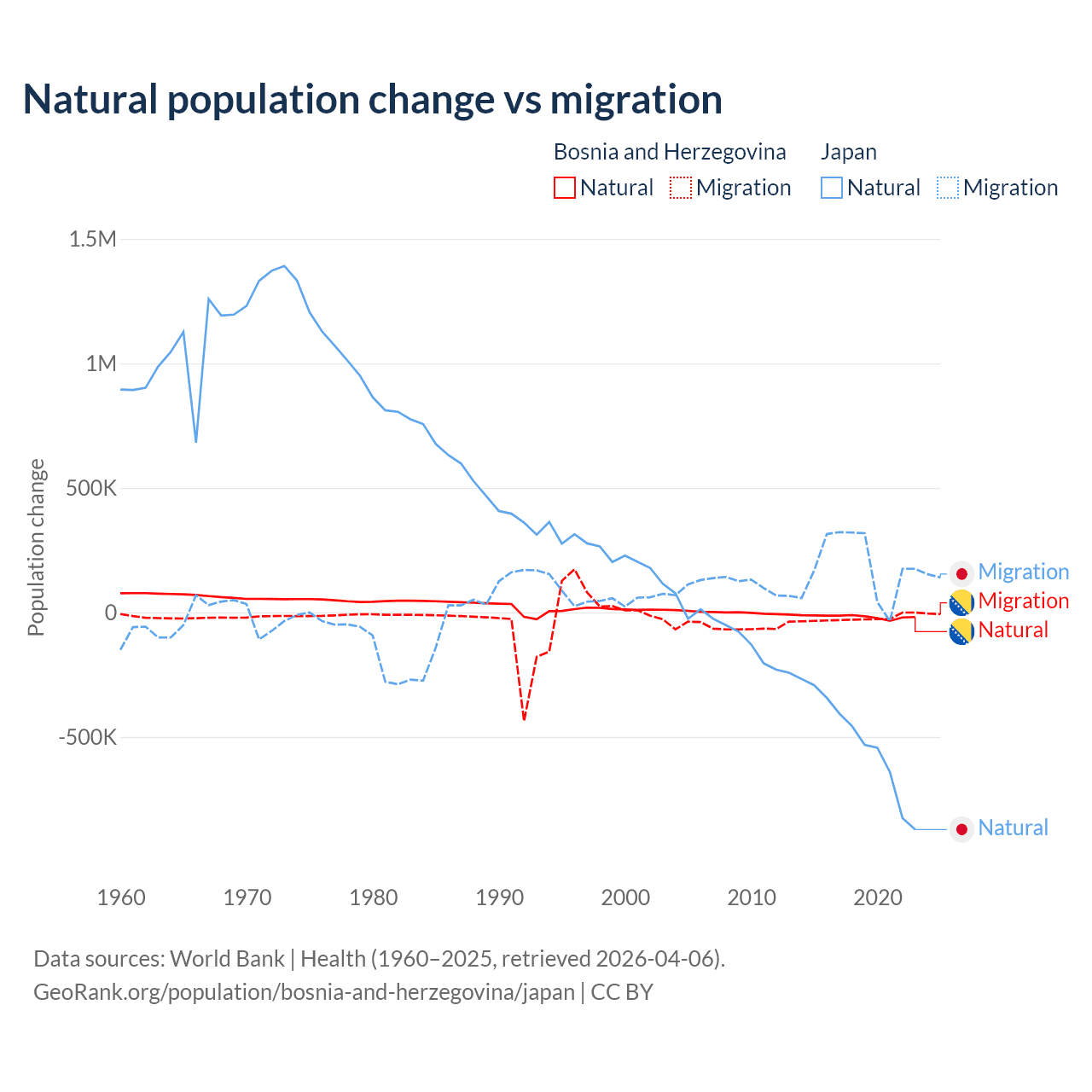 Over the last 10 years, 41.1% of the population change in Bosnia and Herzegovina is from natural causes (a loss of 169,384 people) and 58.9% is from migration (a loss of 243,117 people). In Japan 73.6% is from natural causes (a loss of 5,178,838 people) and 26.4% is from migration (a gain of 1,860,103 people).