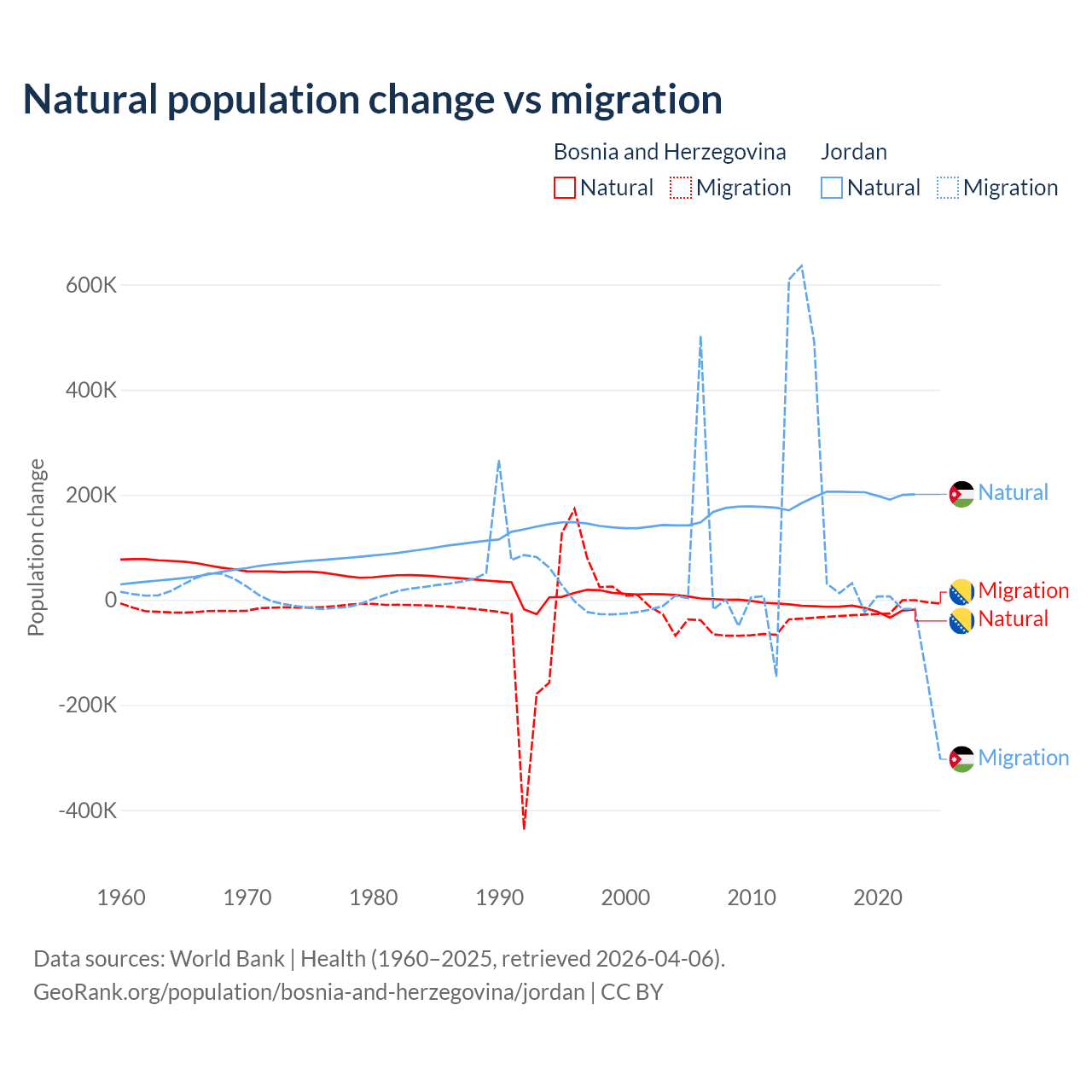 Over the last 10 years, 41.1% of the population change in Bosnia and Herzegovina is from natural causes (a loss of 169,384 people) and 58.9% is from migration (a loss of 243,117 people). In Jordan 63.2% is from natural causes (a gain of 1,991,452 people) and 36.8% is from migration (a gain of 1,157,625 people).
