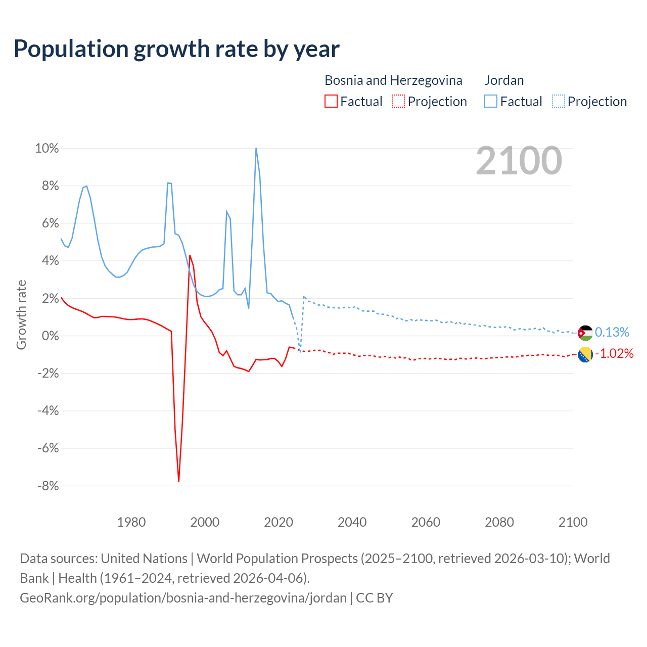 - For the last 10 years, Bosnia and Herzegovina has had an average growth rate of -1.19% per year vs +3.45% in Jordan.