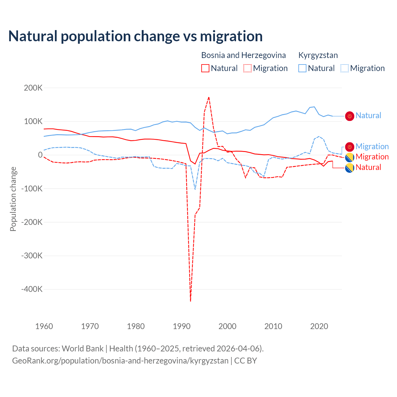 Over the last 10 years, 41.1% of the population change in Bosnia and Herzegovina is from natural causes (a loss of 169,384 people) and 58.9% is from migration (a loss of 243,117 people). In Kyrgyzstan 88.5% is from natural causes (a gain of 1,258,837 people) and 11.5% is from migration (a gain of 164,132 people).