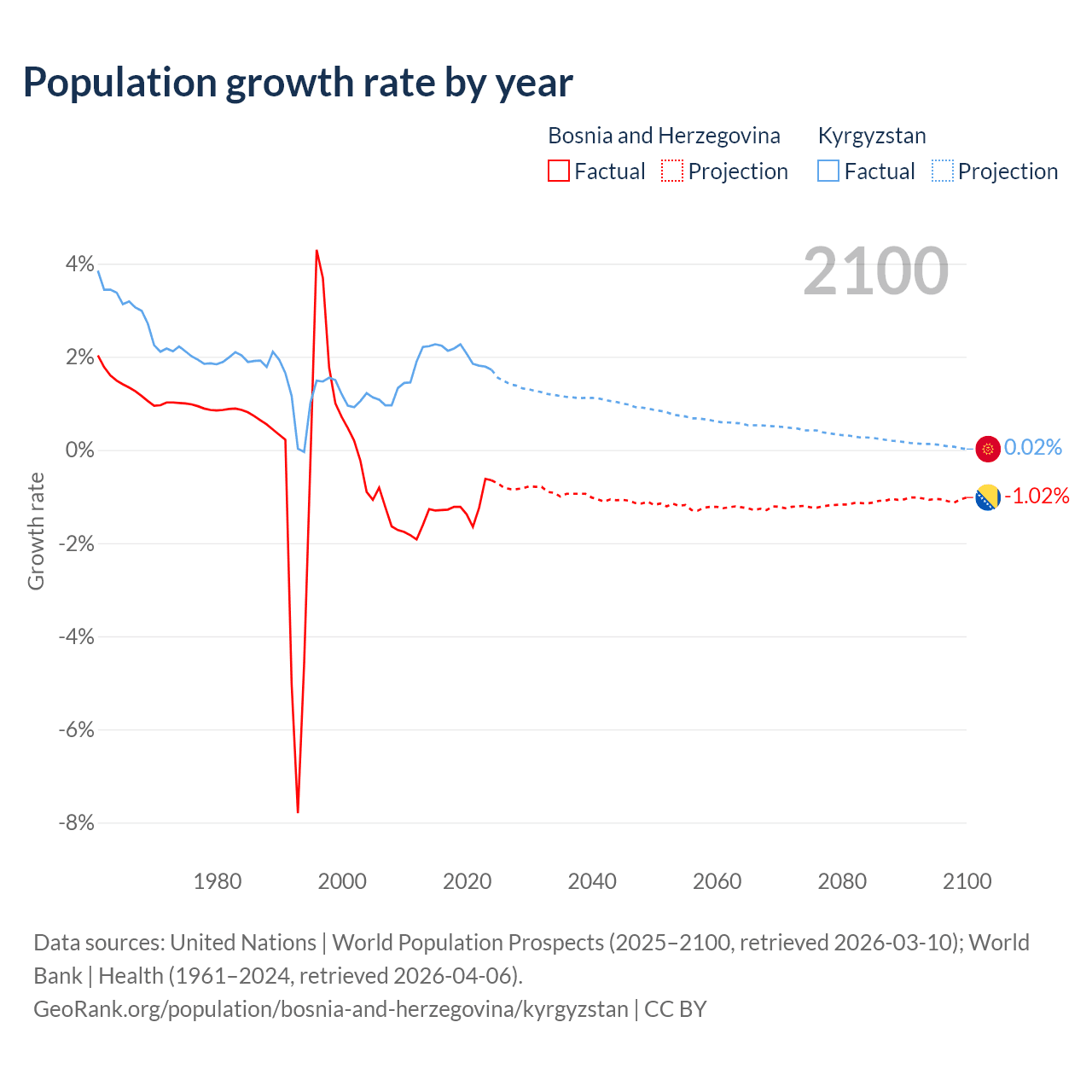 - For the last 10 years, Bosnia and Herzegovina has had an average growth rate of -1.19% per year vs +2.05% in Kyrgyzstan.
