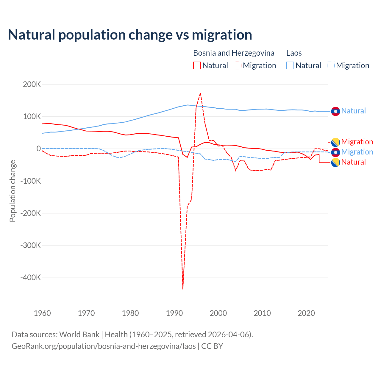 Over the last 10 years, 41.1% of the population change in Bosnia and Herzegovina is from natural causes (a loss of 169,384 people) and 58.9% is from migration (a loss of 243,117 people). In Laos 90.6% is from natural causes (a gain of 1,183,013 people) and 9.41% is from migration (a loss of 122,899 people).
