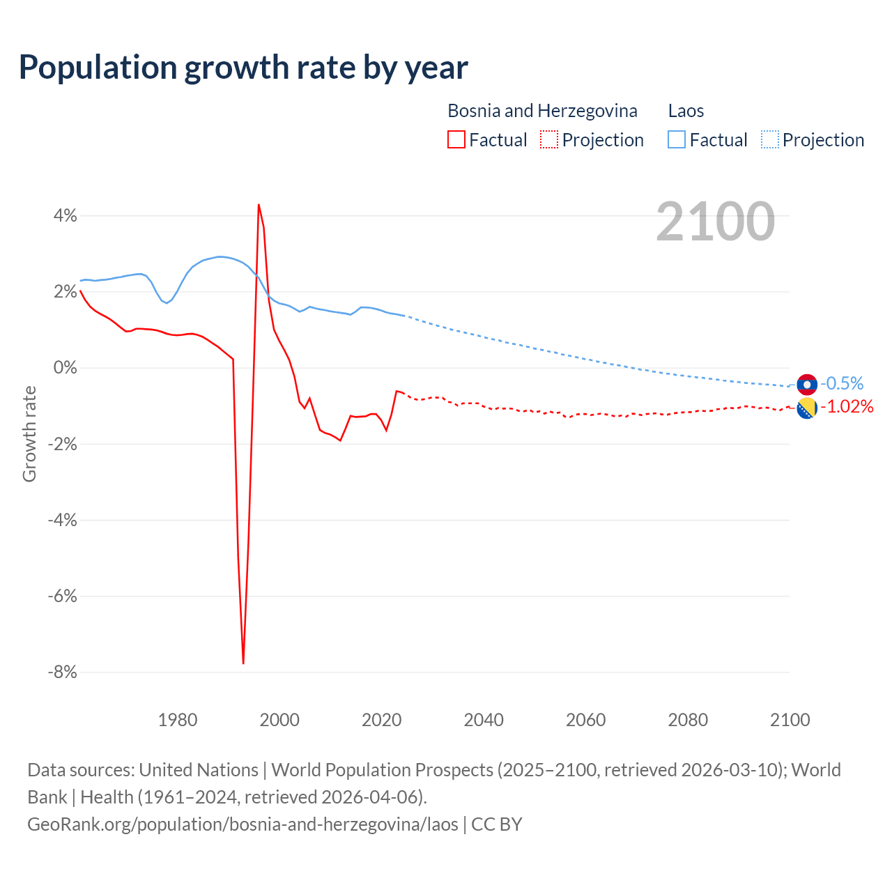 - For the last 10 years, Bosnia and Herzegovina has had an average growth rate of -1.19% per year vs +1.48% in Laos.