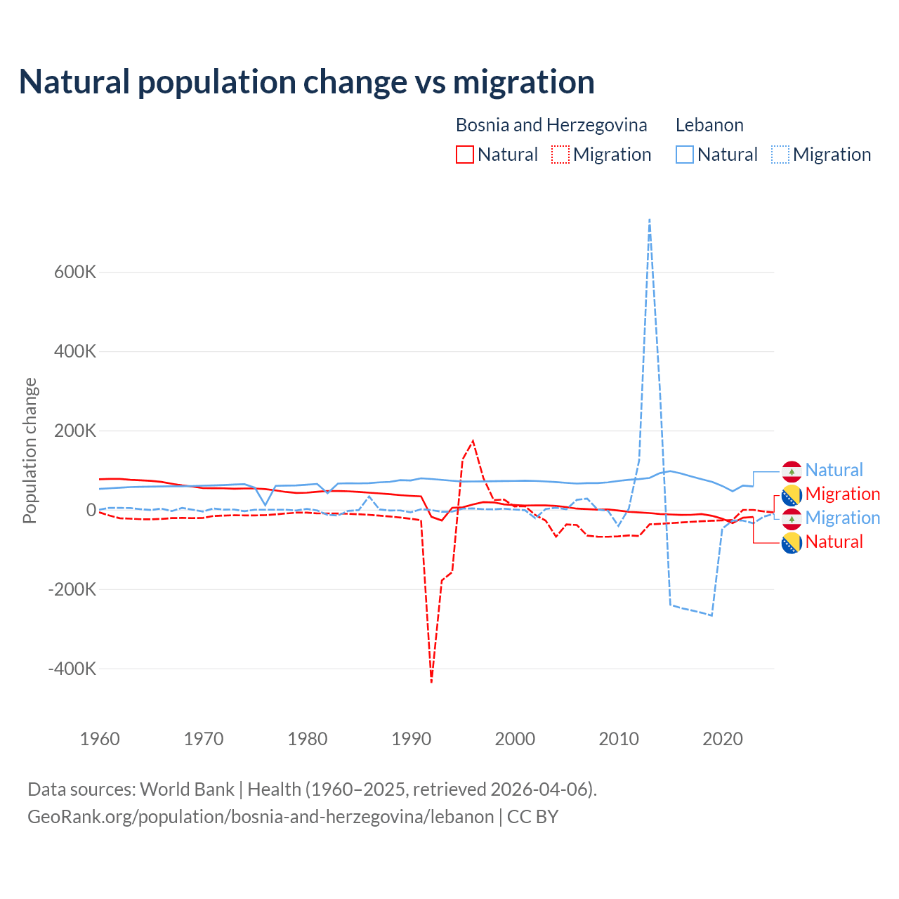 Over the last 10 years, 41.1% of the population change in Bosnia and Herzegovina is from natural causes (a loss of 169,384 people) and 58.9% is from migration (a loss of 243,117 people). In Lebanon 40.1% is from natural causes (a gain of 739,256 people) and 59.9% is from migration (a loss of 1,103,772 people).