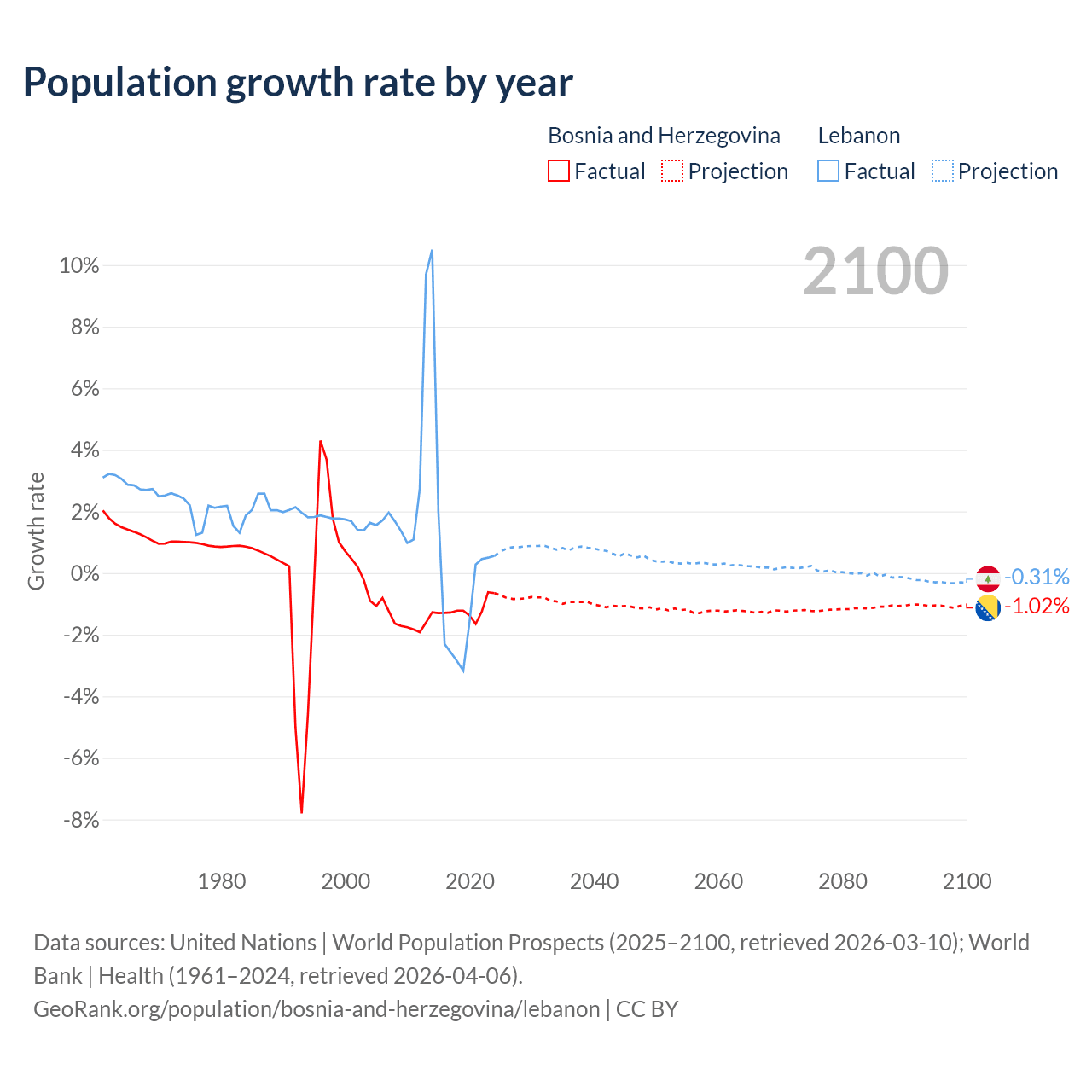 - For the last 10 years, Bosnia and Herzegovina has had an average growth rate of -1.19% per year vs +0.16% in Lebanon.