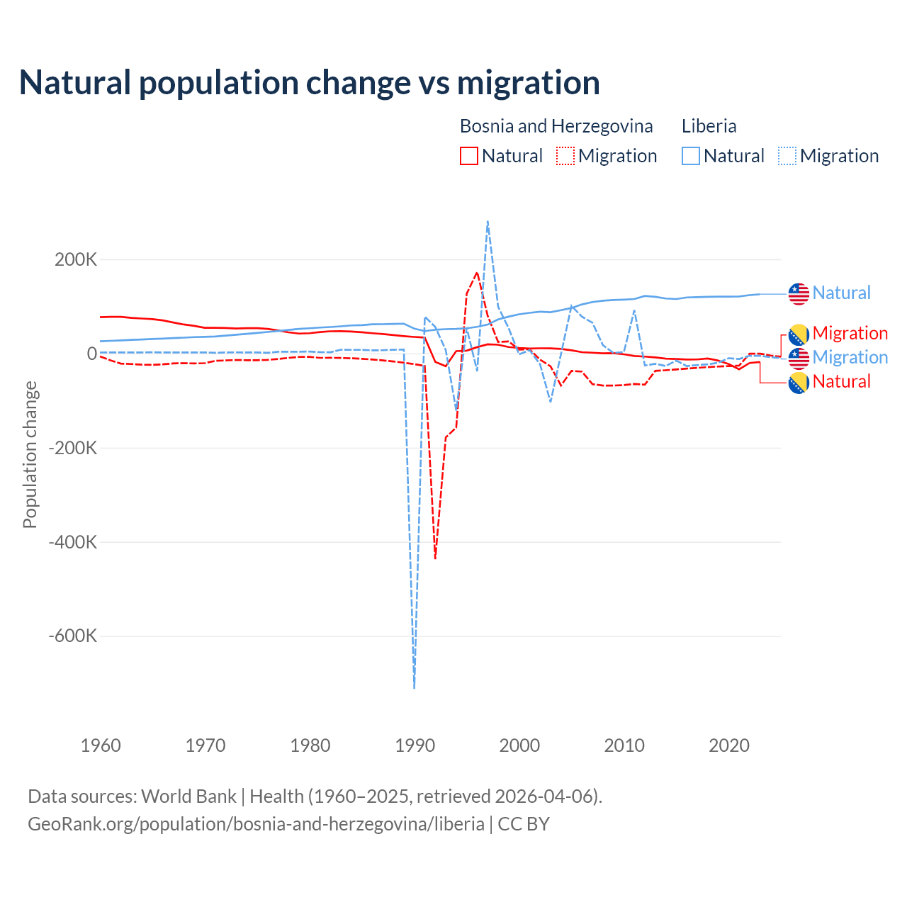 Over the last 10 years, 41.1% of the population change in Bosnia and Herzegovina is from natural causes (a loss of 169,384 people) and 58.9% is from migration (a loss of 243,117 people). In Liberia 87.7% is from natural causes (a gain of 1,202,387 people) and 12.3% is from migration (a loss of 168,316 people).
