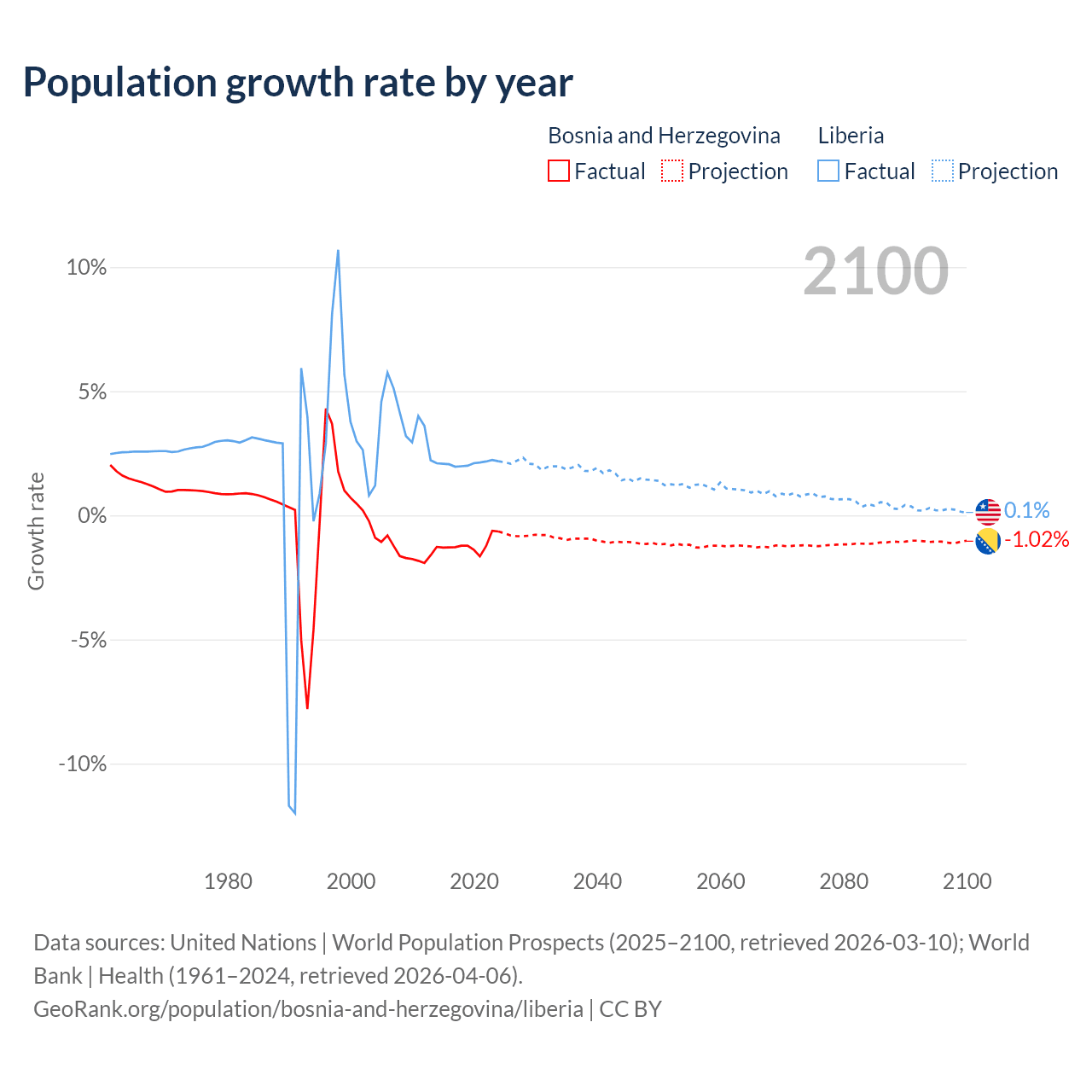 - For the last 10 years, Bosnia and Herzegovina has had an average growth rate of -1.19% per year vs +2.09% in Liberia.