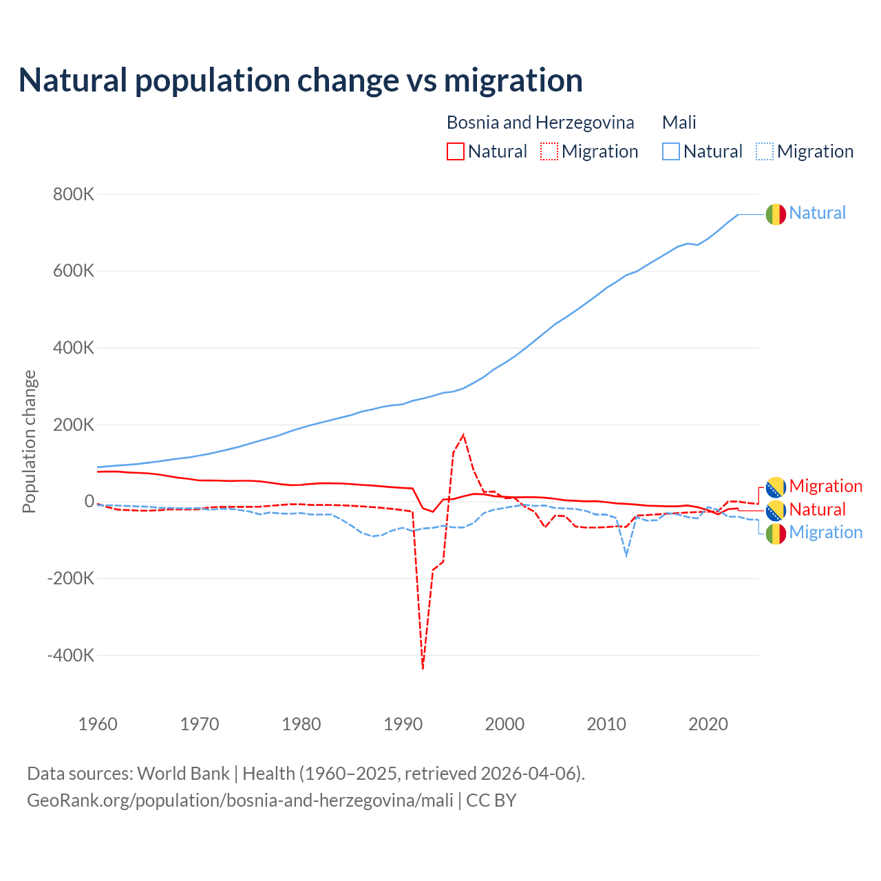 Over the last 10 years, 41.1% of the population change in Bosnia and Herzegovina is from natural causes (a loss of 169,384 people) and 58.9% is from migration (a loss of 243,117 people). In Mali 94.9% is from natural causes (a gain of 6,749,473 people) and 5.13% is from migration (a loss of 365,292 people).
