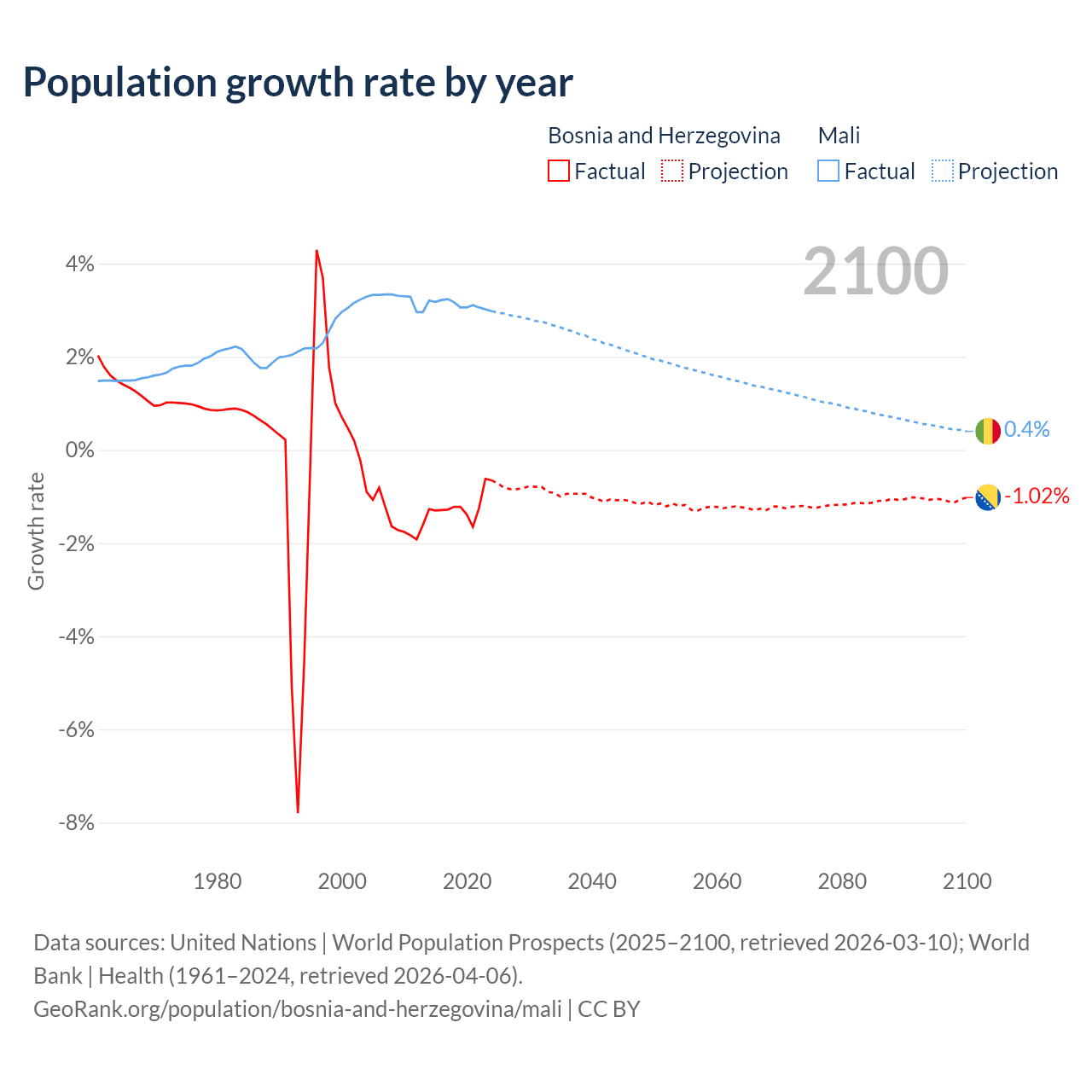 - For the last 10 years, Bosnia and Herzegovina has had an average growth rate of -1.19% per year vs +3.12% in Mali.
