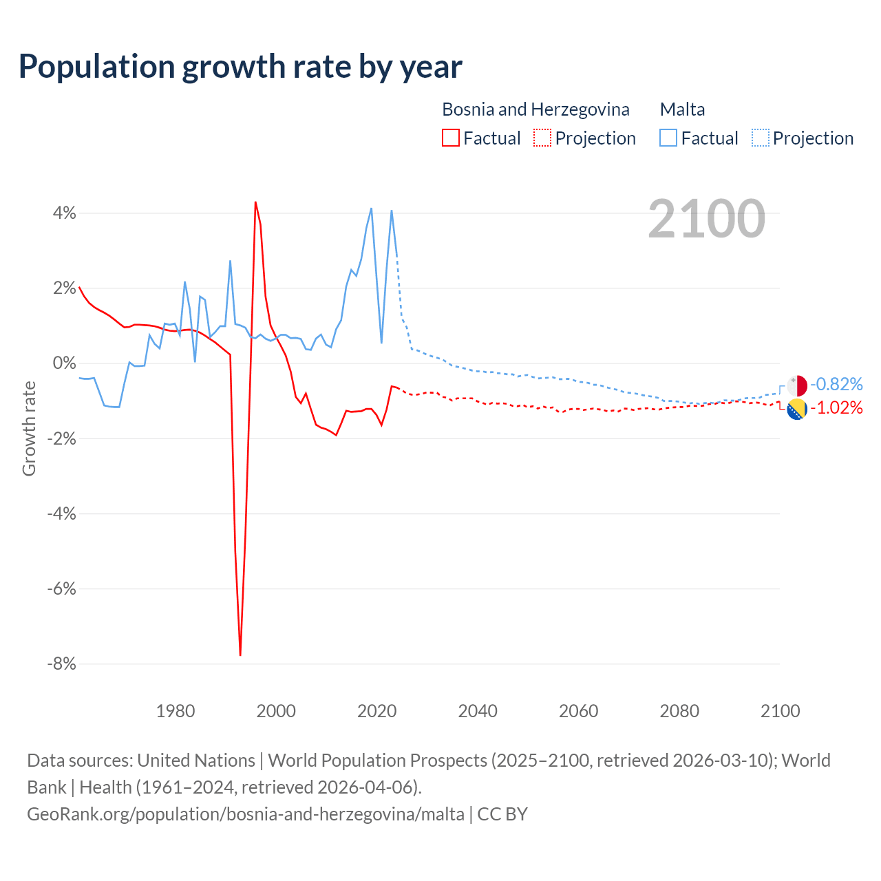 - For the last 10 years, Bosnia and Herzegovina has had an average growth rate of -1.19% per year vs +2.69% in Malta.