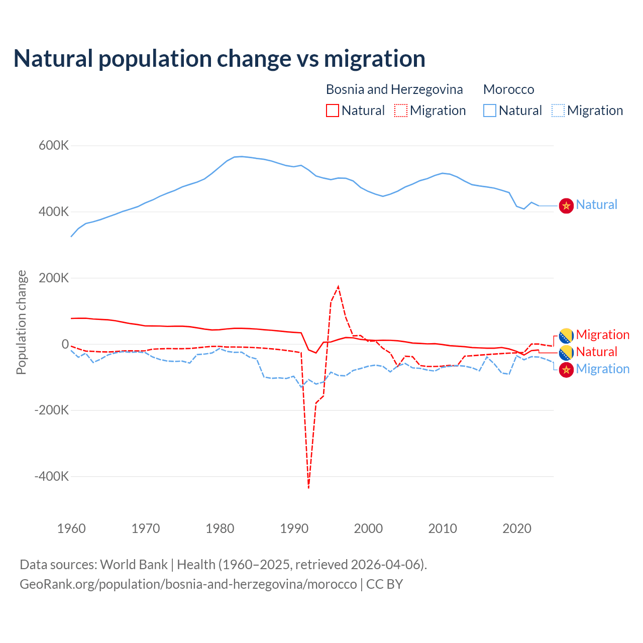 Over the last 10 years, 41.1% of the population change in Bosnia and Herzegovina is from natural causes (a loss of 169,384 people) and 58.9% is from migration (a loss of 243,117 people). In Morocco 88.3% is from natural causes (a gain of 4,495,223 people) and 11.7% is from migration (a loss of 594,083 people).