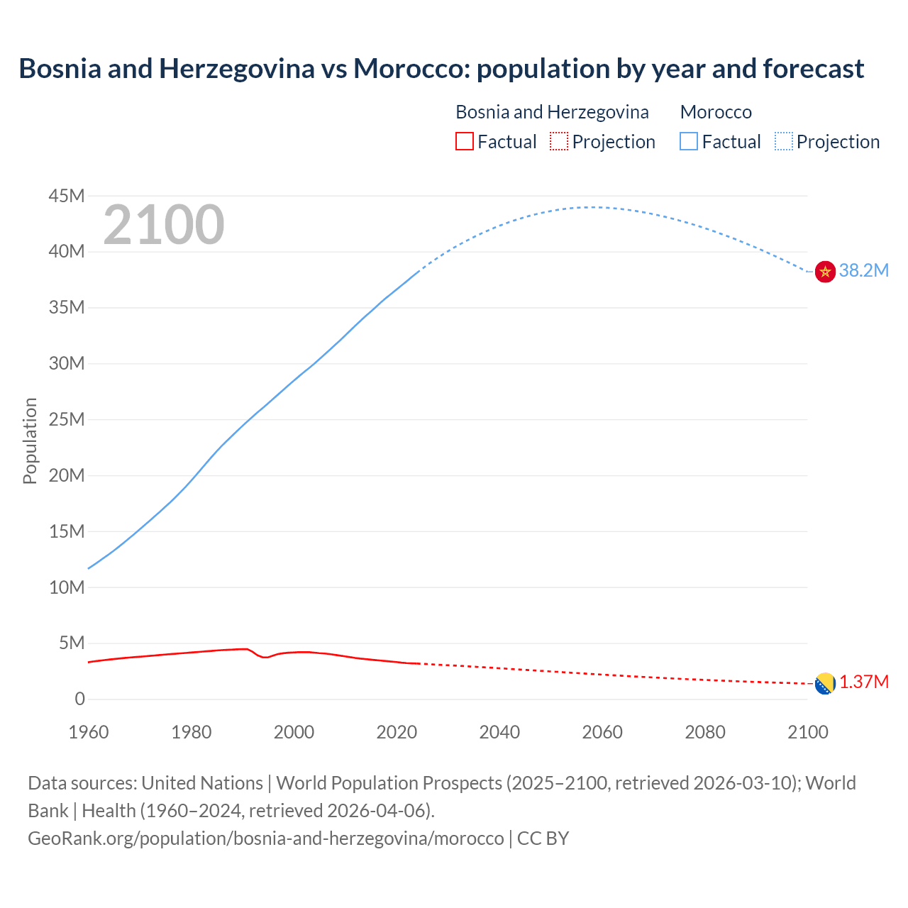 Bosnia and Herzegovina vs Morocco: population by year and forecast